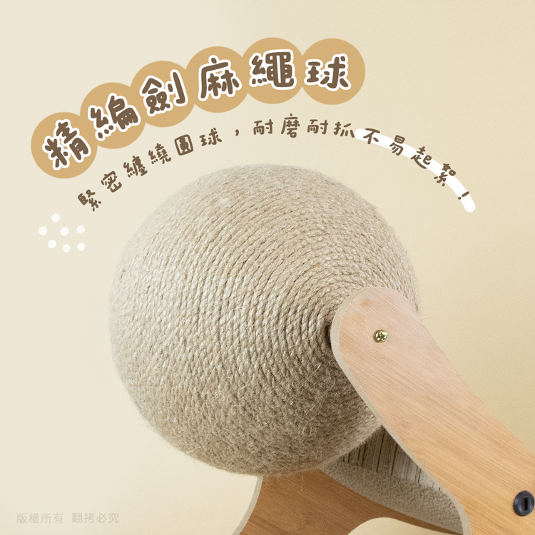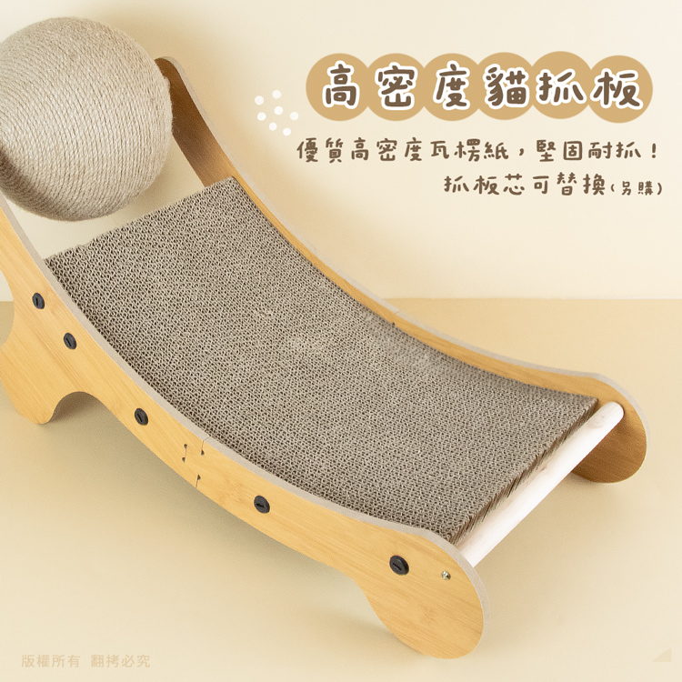 貓本屋 劍麻球耐抓貓抓板貴妃躺椅★適用全齡貓★ -- 磨爪玩樂,臥躺無憂,耐玩劍麻繩球 ---- 弧形高密度貓抓板,好躺好抓,可替換設計 -- 愛玩是貓的天性,而磨爪子會讓牠們感到開心!緊密劍麻繩球,任由貓咪轉動抓玩,盡情釋放天性!曲面弧形抓板設計(可替換),貼合貓咪身體曲線,舒適自然伸展。 採用密集板材+木棍,結構緊密牢固耐用!高密度貓抓板,可供貓咪磨爪。給愛玩的貓咪磨爪子滿足天性!是兼具動與靜多功能的設計,立刻讓貓咪擁有一個可以玩樂/磨爪/睡覺的好物! 注意事項: .本商品為接觸型商品,為避免傳染性疾病(如:跳蚤/壁蝨/疥癬…等) 一經開封或試用過,恕不受理更換事宜。.請遠離高溫源(如:暖氣、火爐…等),以免不慎點燃。.請避免放置於水源或是水氣多的地方,避免瓦楞紙與密集板受潮。.本產品僅供寵物使用,請勿做其他用途。.此商品內附的瓦楞紙屬顧紙製品,在製作上由於裁剪工藝的原因,難免 會有些許切割裁剪留下的痕跡,屬正常情況非瑕疵!.購買前仔細詳閱商品規格尺寸,慎重購買,以免造成日後買賣糾紛。.商品圖檔顏色因電腦螢幕設定差異會略有不同,以實際商品顏色為準。.尺寸與重量皆採手工測量,±5%誤差屬正常範圍。 轉載敬告: 鈞嵐(立嵐)之商品圖文、影片或商標等,皆屬鈞嵐(立嵐)版權所有, 若未經同意即任意轉載刊登者,我司將進行相關智慧財產著作權與 商標權及商業法的追訴權利。 商品規格: .型 號:OO-P-SB26.品 名:貓本屋 劍麻球耐抓貓抓板貴妃躺椅.尺 寸:約 25.5 x 62 x 32.5 cm (±5%/最大外徑).球體直徑:約 Ø18.5 cm.重 量:約 992 g (±5%).貓 抓 板:約 24.5 x 40 x 3 cm / 約 318 g .材 質:劍麻、瓦楞紙、密集板、保麗龍、木頭、塑料.隨附配件:木板(長) x2、木板(短) x2、木棍 x2、劍麻球 x1、 塑膠螺絲 x10、平頭鐵螺絲 x4、螺絲起子 x1、螺絲起子柄套 x1.商品保固:僅限新品瑕疵更可換商品.產 地:中國大陸