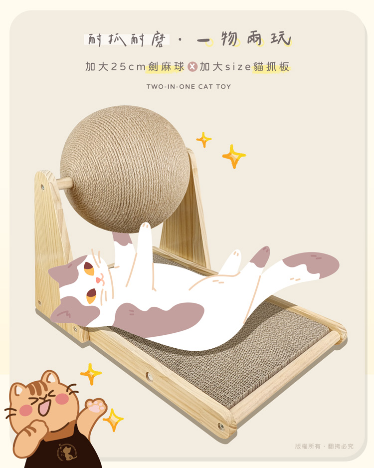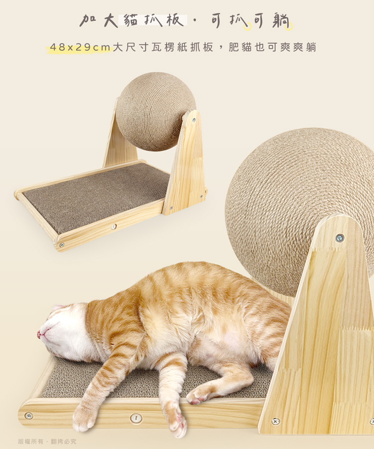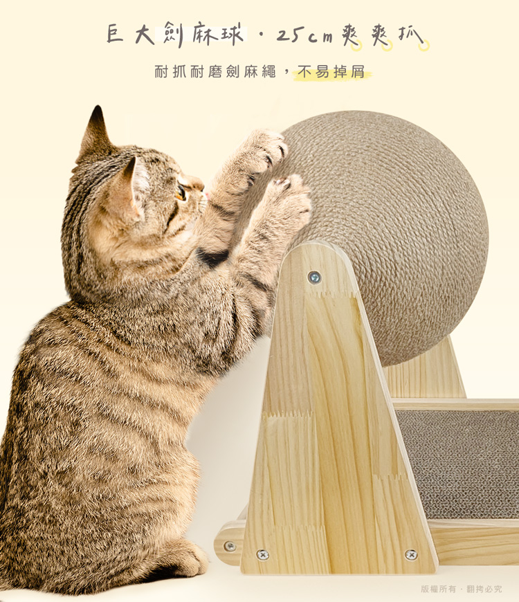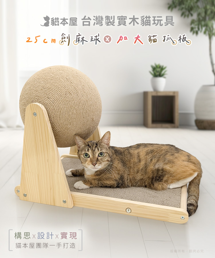 【貓本屋】台灣製 加大貓抓板+25cm加大麻繩球 實木貓玩具-OO-P-TST525Y