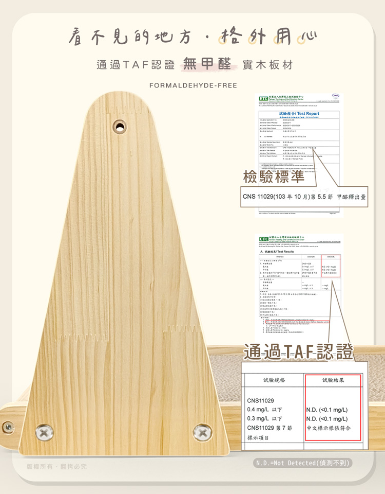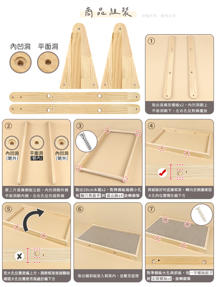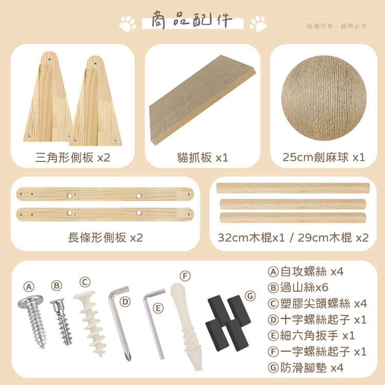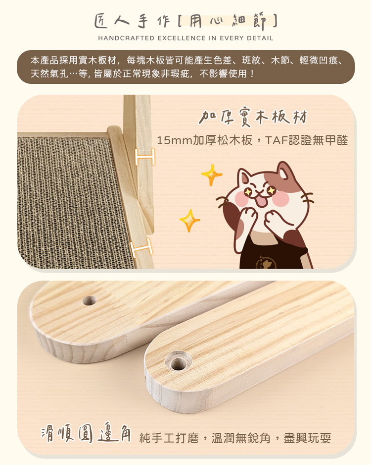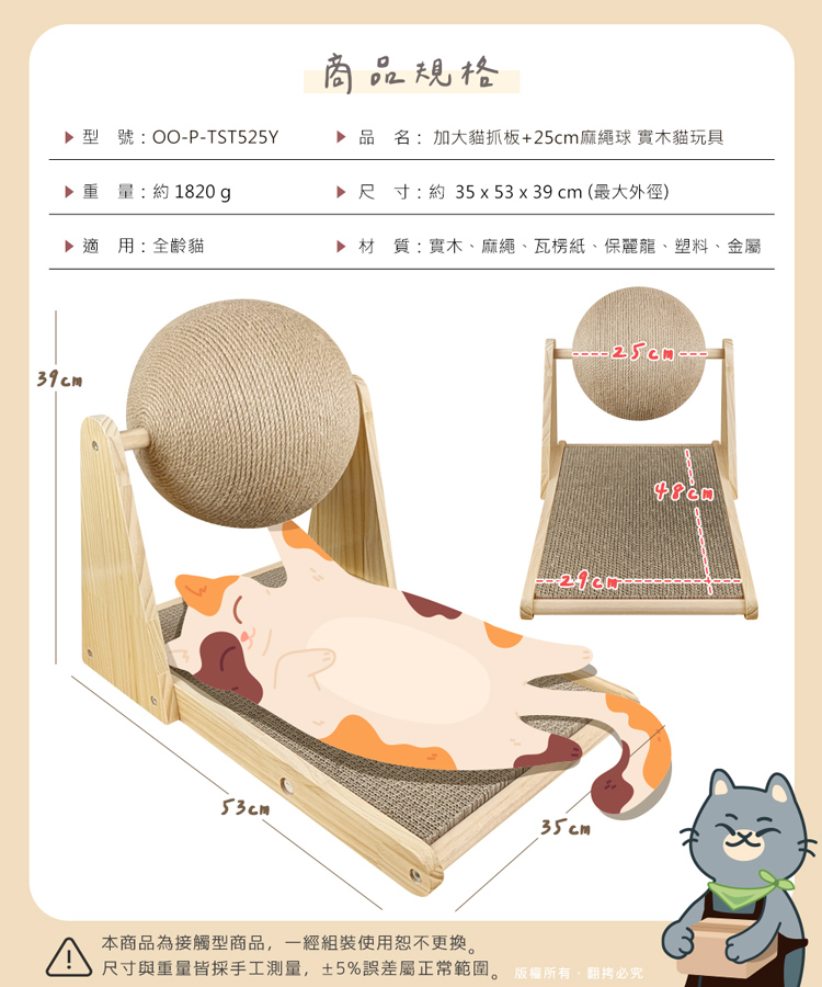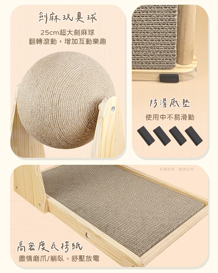 貓本屋 台灣製 加大貓抓板+25cm加大麻繩球 實木貓玩具 --厚實實木 x 麻繩球玩具 x 磨抓貓抓板 x 防滑設計----貓咪的小玩具,給貓咪一個玩到忘記罐罐的好理由-- 秉持匠人精神,每個實木玩具皆由台灣【貓本屋】獨家打造,從選材、裁切、打磨、裝箱,每個細節都蘊含對毛孩的關愛與用心。 採用1.5cm加厚實木板材,邊角皆經純手工打磨,溫潤無銳角,讓毛孩玩的更安心。實木板材通過TAF無甲醛檢驗,真正做到安全無憂。 搭配25cm特大麻繩球,讓愛拍、愛撲、愛磨指甲的貓咪一次玩到爽。底層採用大尺寸瓦楞紙抓板,滿足每日例行的抓抓儀式。四腳防滑腳墊,不管主子怎麼甩、怎麼衝,都能穩穩站住不易滑動。注意事項: .本產品採用實木板材,每塊木板皆可能出現色差、紋理差異、木節、輕微凹痕、 天然氣孔…等,皆屬正常,非瑕疵,且不影響使用!.實木產品在熱脹冷縮的作用下,板材均會有變形率,屬於正常現象。.本商品為接觸型商品,為避免傳染性疾病(如:跳蚤/壁蝨/疥癬…等) 一經開封或組裝試用過,恕不受理更換事宜。.購買前請仔細詳閱商品規格與尺寸,謹慎選購,以避免日後產生買賣糾紛。.本產品僅供寵物使用,請勿用於其他用途。.組裝時,請務必將螺絲與配件鎖緊,以確保結構穩固。.尺寸與重量皆採手工測量,±5%誤差屬正常範圍。 轉載敬告: 鈞嵐(立嵐)之商品圖文、影片或商標等,皆屬鈞嵐(立嵐)版權所有, 若未經同意即任意轉載刊登者,我司將進行相關智慧財產著作權與 商標權及商業法的追訴權利。 產品規格: .商品型號:OO-P-TST525Y.商品名稱:貓本屋 台灣製 加大貓抓板+25cm加大麻繩球 實木玩具.尺 寸:約 53 x 35 x 39 cm (最大外徑).重 量:約 1820 g.適用範圍.全齡貓.材 質:實木、麻繩、瓦楞紙、塑料、金屬、保麗龍.包裝內含:三角形側板 x2、長條形側板 x2、29cm木棍 x2、32cm木棍 x1、 25cm麻繩球 x1、貓抓板 x1、自攻螺絲 x4、過山絲 x6、塑膠尖頭螺絲 x4、 十字螺絲起子 x1、細六角扳手 x1、一字螺絲起子 x1、防滑腳墊 x4.商品保固:僅限新品瑕疵可更換商品