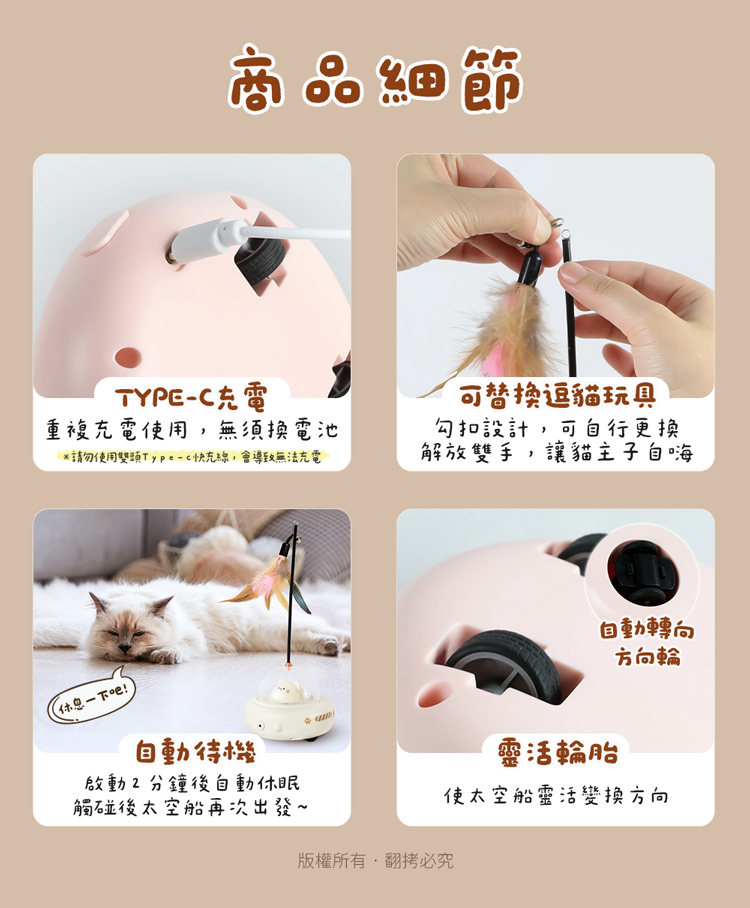 貓本屋 太空船紅外線 電動逗貓玩具 ★自嗨神器★ --懶人逗貓棒,可掛鈴鐺/羽毛,可隨時替換-- 內置紅點激光,移動軌跡模擬小獵物奔逃,激發貓咪狩獵的慾望智能掉頭,遇到障礙物會自動改變方向,無需擔心玩具會滯留在角落。 自動待機休眠模式,開機即啟動,運轉2分鐘後,進入休眠狀態,貓咪觸碰就會再次觸發啟動。 Q萌貓咪乘坐太空船造型,柔和呼吸燈光USB充電設計免除了更換電池的麻煩,環保又方便。 可在室內隨時隨地與貓咪互動,幫助釋放精力,減少焦慮與破壞行為;讓貓咪在家中也能享受狩獵般的樂趣。 ※為產品充電時,請使用內附充電線或是USB對Type-C充電線。※勿使用雙頭Type-C快充線,以免無法正常充電。※本產品僅用於寵物使用,切勿用於其他用途。 <圖> 注意事項: .本商品為接觸型商品,為避免傳染性疾病(如:跳蚤/壁蝨/疥癬…等) 一經開封或試用過,恕不受理更換事宜。.購買前仔細詳閱商品規格尺寸,慎重購買,以免造成日後買賣糾紛。.為產品充電時,請使用內附充電線或是USB對Type-C充電線。.勿使用雙頭Type-C快充線,以免無法正常充電.所有的規格與重量皆採手工測量,誤差±5%屬正常範圍。 轉載敬告: 鈞嵐(立嵐)之商品圖文、影片或商標等,皆屬鈞嵐(立嵐)版權所有, 若未經同意即任意轉載刊登者,我司將進行相關智慧財產著作權與 商標權及商業法的追訴權利。 商品規格: .型 號:OO-P-T27.品 名:貓本屋 太空船紅外線 電動逗貓玩具.尺 寸:約 10.5 x 10.5 x 27 cm.重 量:約 138 g.供電模式:內建可充電式鋰電池.電池容量:300 mAh.充電介面:Type-C.額定電壓:5V.額定電流:1A.額定功率:5W.指 示 燈:充電中-亮紅燈;充飽電-熄燈.適用範圍:全齡貓.材 質:ABS、電子元件.包裝內含:電動逗貓玩具 x1、Type-C充電線 x1、說明書 x1.商品保固:僅限新品瑕疵更可換商品