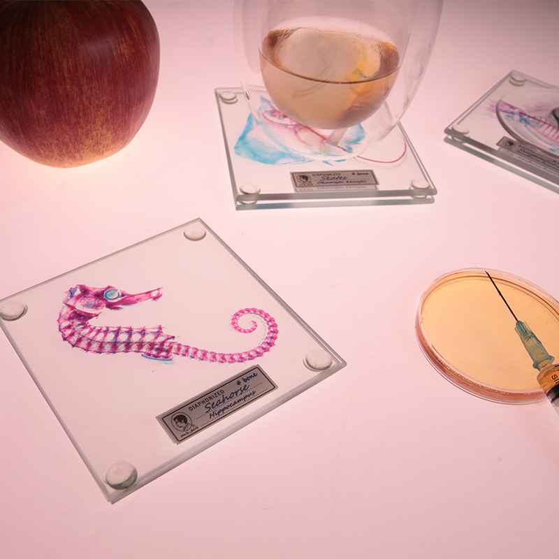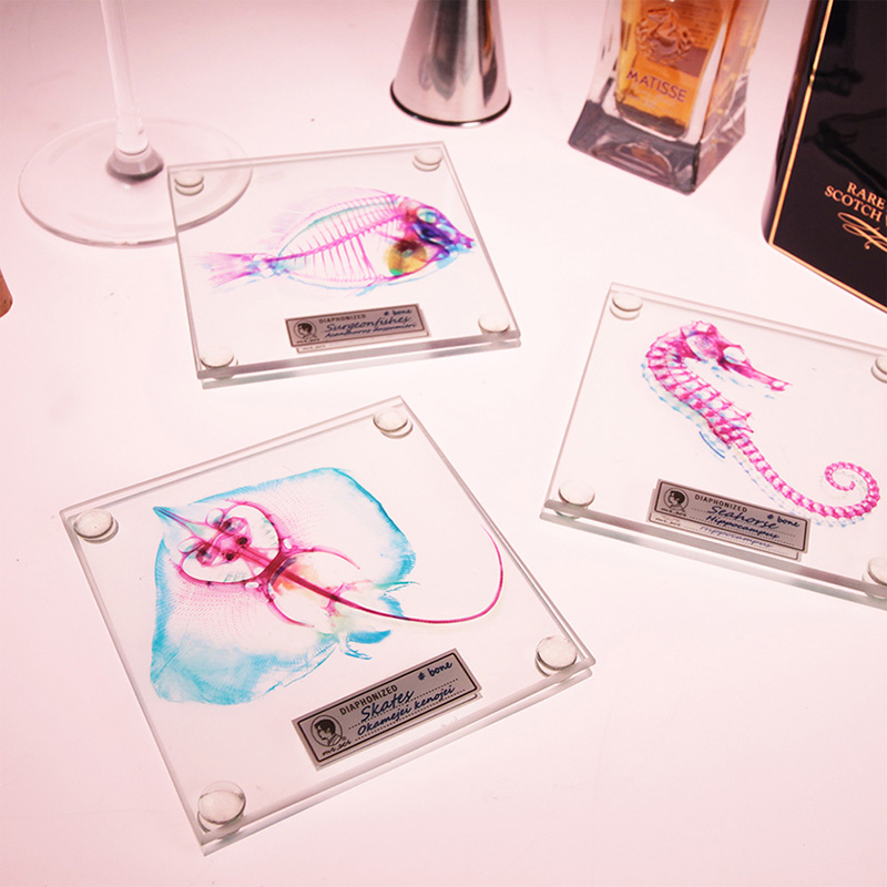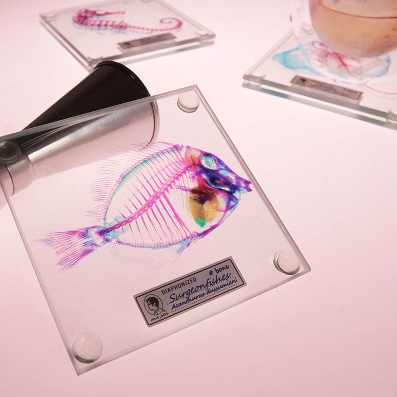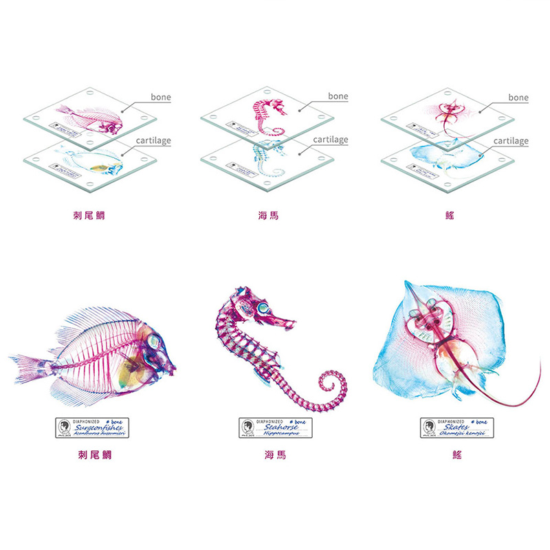 使用真實且細緻度極高的透明魚實拍照做為玻璃杯墊素材,兩片杯墊分別呈現了骨頭和軟骨在染色後的漸變、鮮豔效果。耐熱實用,無論是在實驗室或辦公室,均為理科和生物愛好者絕對必備的一套特色杯墊!鰩:鰩總目(學名:Rajomorphii),又名魟總目,是軟骨魚綱的一個總目,包括我們日常生活提及的魔鬼魚及其他鰩科生物,合計有約560個物種,可分為13個科。鰩總目跟鯊魚所屬的鯊總目同屬板鰓亞綱,兩者關係密切。鰩總目物種的特徵在於其扁平的身體,巨大的胸鰭和頭部合而為一,而五到六對的鰓裂則位於體部下方。(來源:wikipedia)海馬:海馬屬於輻鰭魚綱的魚類,是一種小型海洋動物,身長5-15厘米。因頭部彎曲與體近直角而得名。在希臘神話中,海馬被視作為海神的坐騎。(來源:wikipedia)刺尾鯛:廣泛分布於除地中海外之熱帶及亞熱帶的海域。體呈卵圓形或長橢圓形,側扁;尾柄細而有力。口小,端位,具一列密生的門齒狀之齒或細長的刷毛狀齒。體被小櫛鱗,有些固生於皮膚,使得表皮粗糙如砂紙,故中文又名之 「粗皮鯛」;側線完整。背鰭一枚,連續且基底長;尾鰭凹形、新月形或截形。尾柄部有一至數枚之硬棘或骨板,有時退化或消失。(來源:台灣魚類資料庫)透明魚對於學術研究上,提供了非常大的幫助,關於魚類的演化、外型、成長過程等,都能透過透明魚標本解密。色彩豔麗的透明魚標本你也心動了嗎?不仿來體驗這奇幻的奧秘吧!產品規格 :► 尺寸:9 x 9 cm ; 厚度0.3cm► 材質:玻璃► 製造地:中國注意事項 :► 商品為易碎品,請小心使用。► 可供熱飲放置
