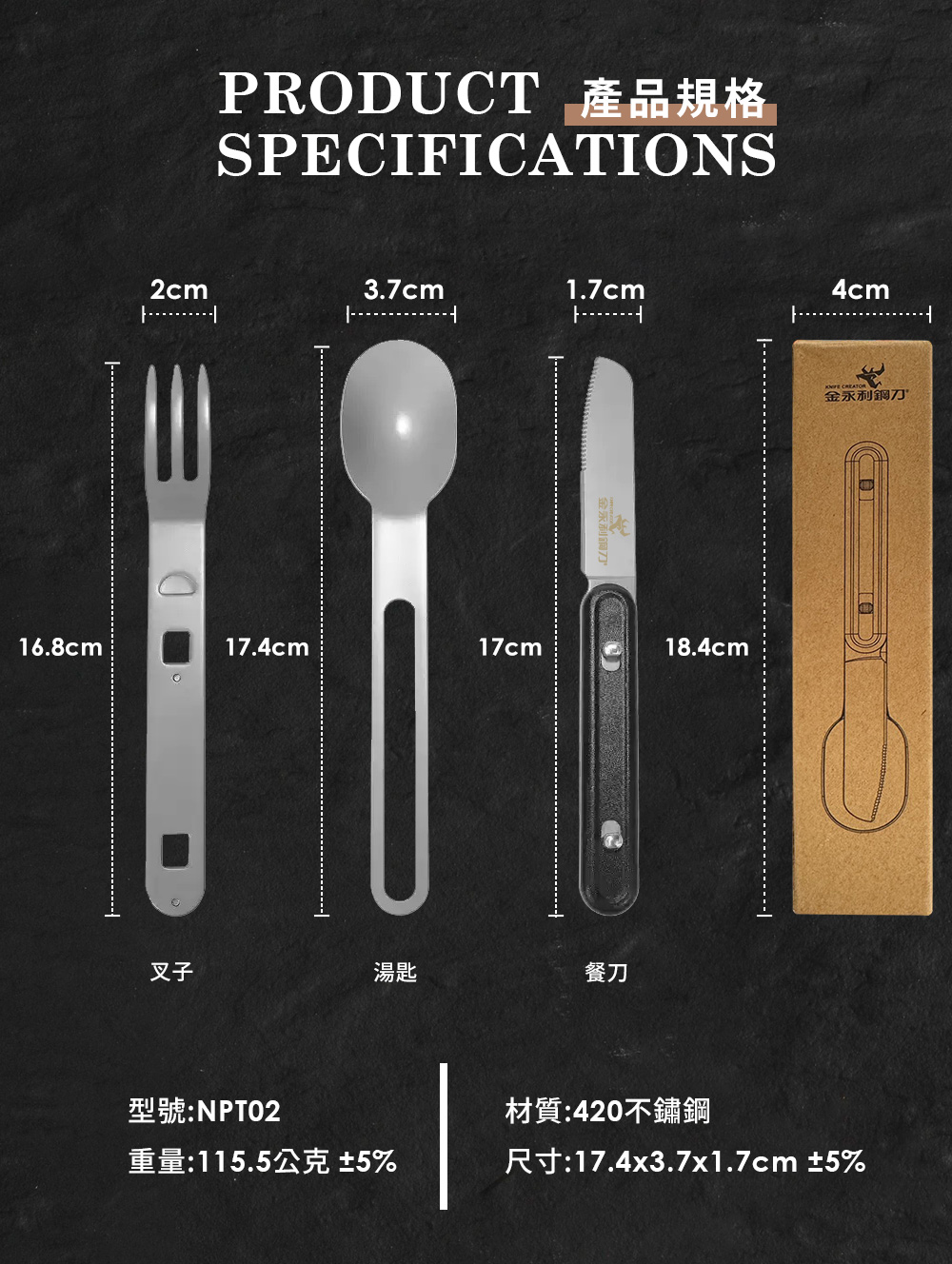 【金永利鋼刀】420不銹鋼戶外多功能餐刀/湯匙/叉子組合餐具露營餐具