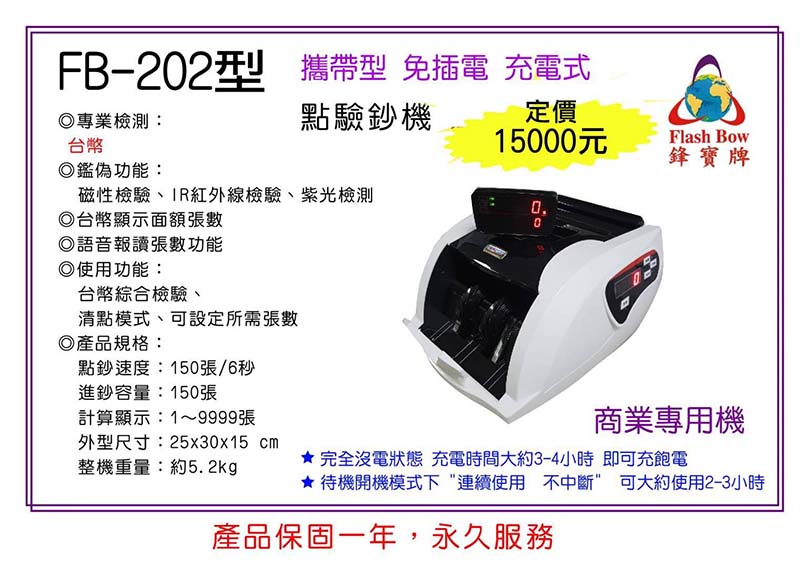鋒寶牌 商業 專用機 攜帶型 免插電 充電式 點鈔機 驗鈔機 / 台 FB-202 (台幣)