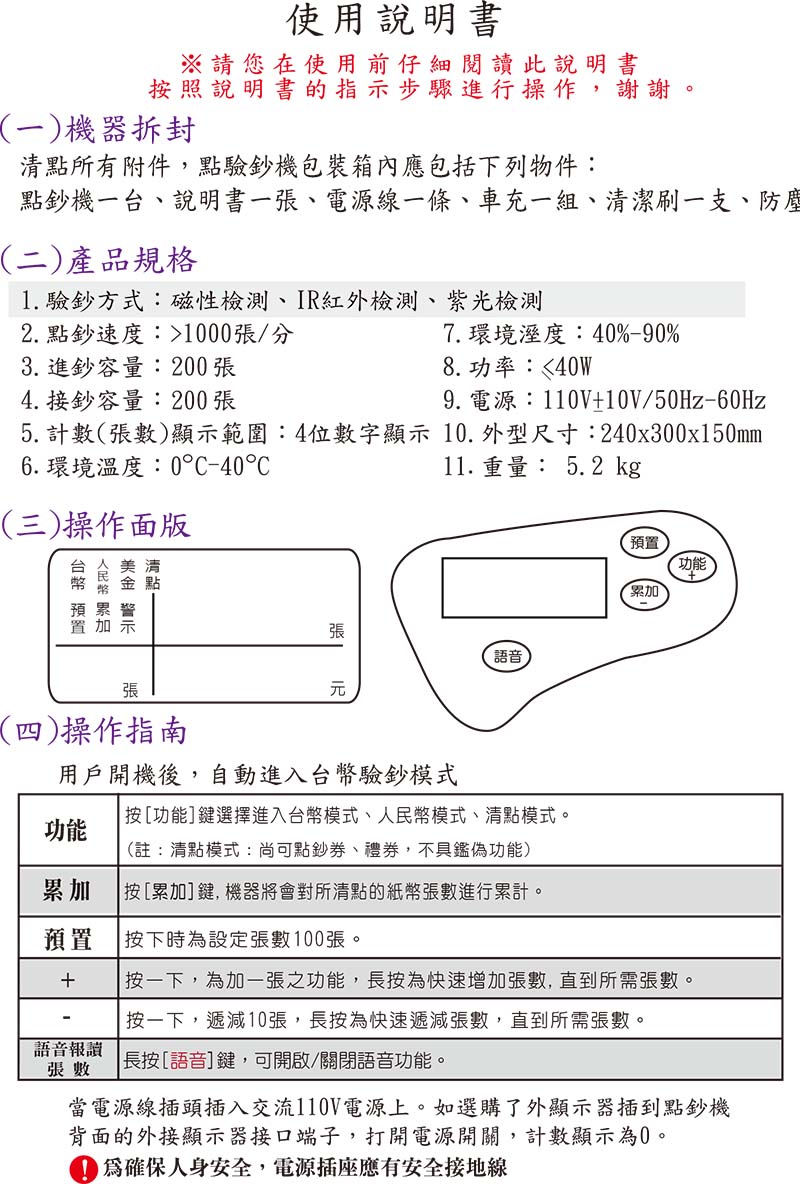 【商品規格】專業檢測:台幣鑑偽功能:磁性檢驗/IR紅外線檢驗/紫光檢測功能: 攜帶型 免插電 充電式 台幣顯示面額張數語音讀報張數功能台幣綜合檢驗、清點模式、可設定所需張數產品規格:點鈔速度:150張/6秒進鈔容量:150張計算顯示:1~9999張外型尺寸:25x30x15 cm整機重量:約5.2kg 廠商代號:Z11責任代號:QMW