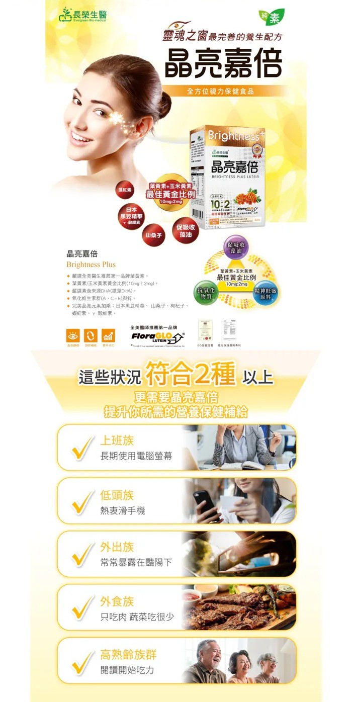 嚴選全美醫師推薦第一品牌葉黃素 葉黃素/玉米黃素黃金比例(10mg:2mg) 嚴選素食來源DHA(微藻DHA) 含氧化維生素群(A.C.E)與鋅 添加枸杞子、山桑子 晶采有感 添加日本黑豆精華、穀維素、藻紅素 選用素食膠囊 全素可食