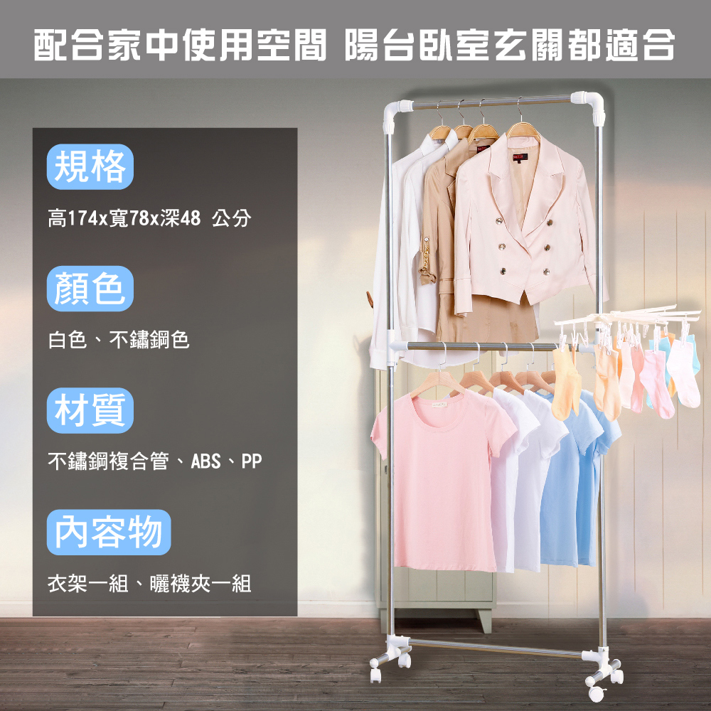 【雙手萬能】 單桿活動曬衣架附曬襪架(附滾輪/吊衣架/衣桿)
