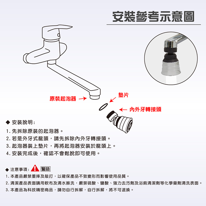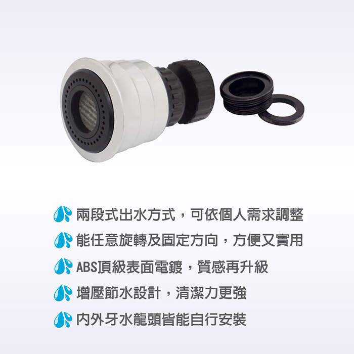 【商品特色】360度轉向 多角度清洗兩段式出水 輕鬆切換細緻柔軟出水通用規格 簡易安裝∕【商品規格】材 質:ABS塑膠規 格:長6x寬3.8x高3.8 公分重 量:31g (±5%)產 地:中國屬 性:DIY產品需自行安裝∕【選購前注意事項,請詳細閱讀】◆請參閱圖片及文案敘述◆不含陳列品◆本賣場提供商品均為實品拍攝;商品顏色依各商品頁中呈現為準。 因每個人使用瀏覽設備(ex.手機、電腦螢幕等)因廠牌/顯示/設定等均不相同,會因此直接影響圖片顏色呈現。顏色以實際商品為準。對於色差或材質敏感的買家,建議直接至實體店面購買,避免造成不必要的糾紛與誤解。