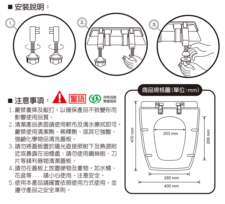 【商品特色】高級塑料堅固耐用適用一般通用型單體馬桶附安裝說明書,輕鬆組裝DIY★ 馬桶蓋商品屬於私人、衛生、貼身用品,為了保障每個顧客的衛生安全,請在購買前確認好商品規格尺寸是否與馬桶吻合,若非瑕疵商品,收縮膜經拆封後無法進行退換貨,請知悉★ ∕【商品規格】規 格:長47 x 寬40 x 高6.5(公分)材 質:PP塑膠重 量:2.4kg (±5%)產 地:台灣屬 性:DIY產品,需自行安裝∕【選購前注意事項,請詳細閱讀】● 此商品有白色/牙色二色● 適用於和成阿爾卑斯系列、TOTO、電光等品牌● 內附2種規格之通用螺絲包(螺絲孔距為17cm及14.5cm、螺絲長4cm)● 本賣場提供商品均為實品拍攝;商品顏色依各商品頁中呈現為準。 因每個人使用瀏覽設備(ex.手機、電腦螢幕等)因廠牌/顯示/設定等均不相同,會因此直接影響圖片顏色呈現。顏色以實際商品為準。對於色差或材質敏感的買家,建議直接至實體店面購買,避免造成不必要的糾紛與誤解。#馬桶蓋 #單體 #和成 #台灣製 # #含運 #TOTO #電光 #CF801 #C4232 #CF8400