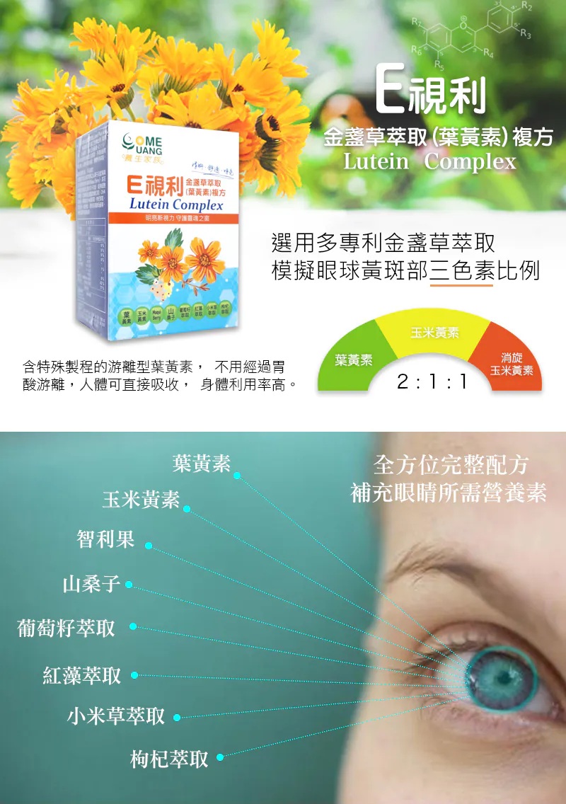 1. 選用特殊技術萃取之"金盞草(Lutein Plus with MZ)" , 模擬眼球黃斑部三色素比例(葉黃素:玉米黃素:消旋玉米黃素=2:1:1), 含特殊製程的游離型葉黃素. 不用經過胃酸游離.人體可直接吸收 吸收利用率高2. 完整配方包含高花青素之山桑子及藍莓與風行歐美的智利酒果(Maqui Berry).其花青素的含量是紅酒的30~60倍.還有細胞營養素,紅藻萃取(含3%蝦紅素).DHA藻油粉.同時添加小米草萃取, 玻尿酸,枸杞萃取, 維生素A, 維生素E,酵母鋅與酵母硒等.補充眼睛所需營養素.3. 粉劑好吸收! 鋁箔包裝安全衛生! 攜帶方便!