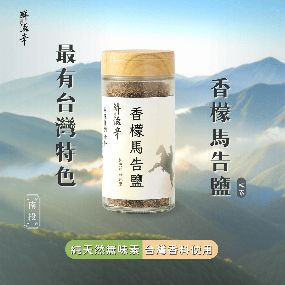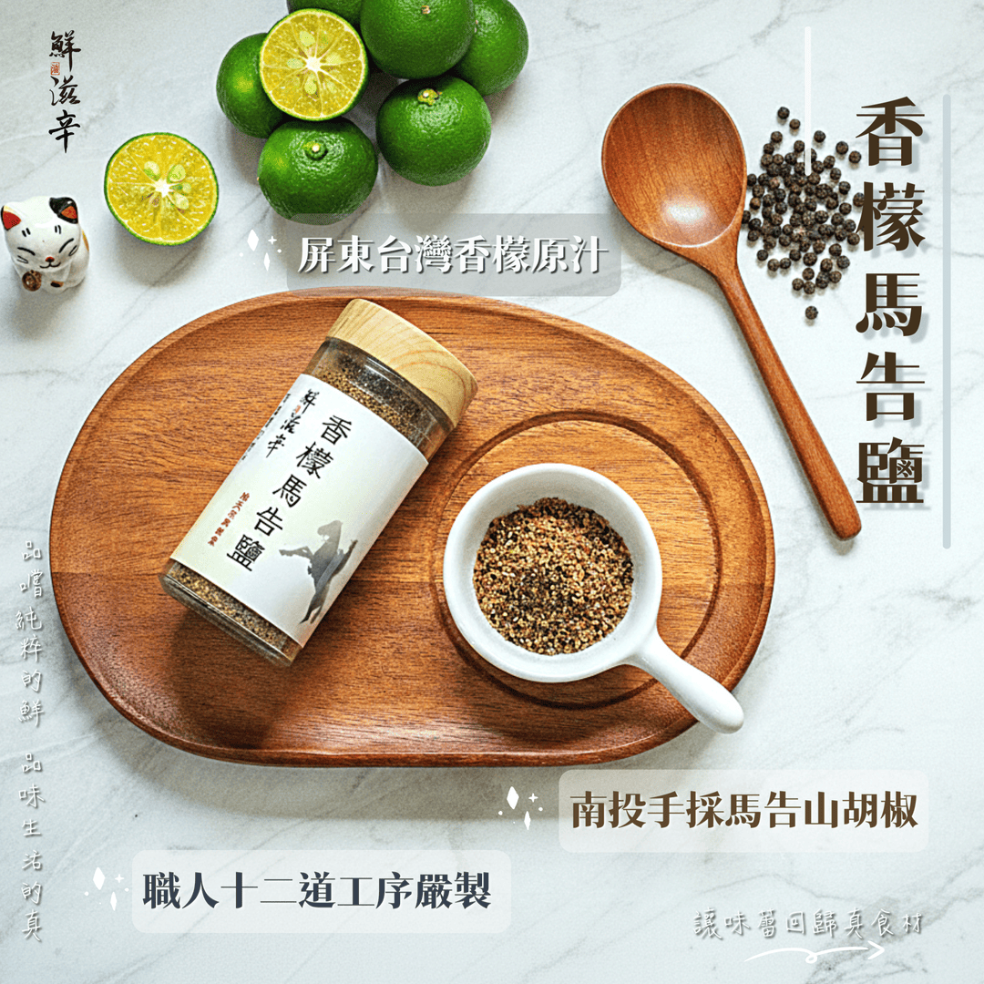 精選台灣特有"台灣香檬",含有獨特清爽酸香滋味。以獨家研發技術將原汁原味融入於天然海鹽中。 並加入台灣特有香料"馬告"山胡椒,微酸清爽的香氣碰上馬告獨特且濃郁的特殊風味, 最適合燒烤、炸物、輕食水煮料理添香解膩。酸香好滋味讓料理提升新境界!感受美食新饗宴!
