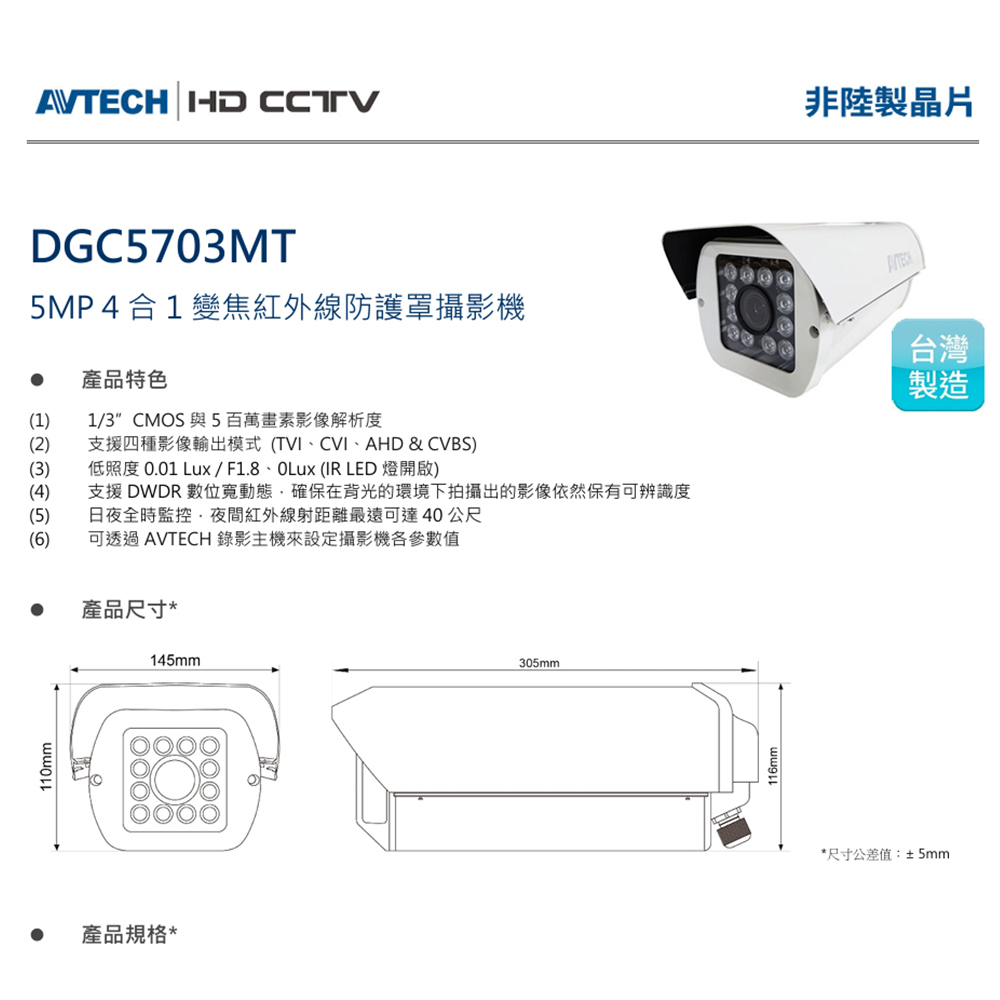 昌運監視器 AVTECH 陞泰 DGC5703MAT 5MP 4合1變焦紅外線防護罩攝影機(取代DGC5703F)