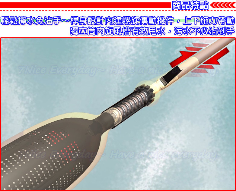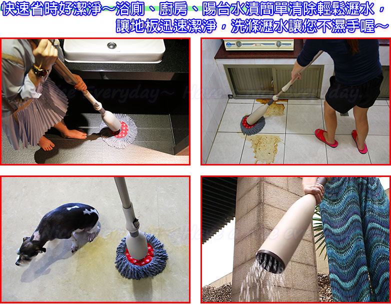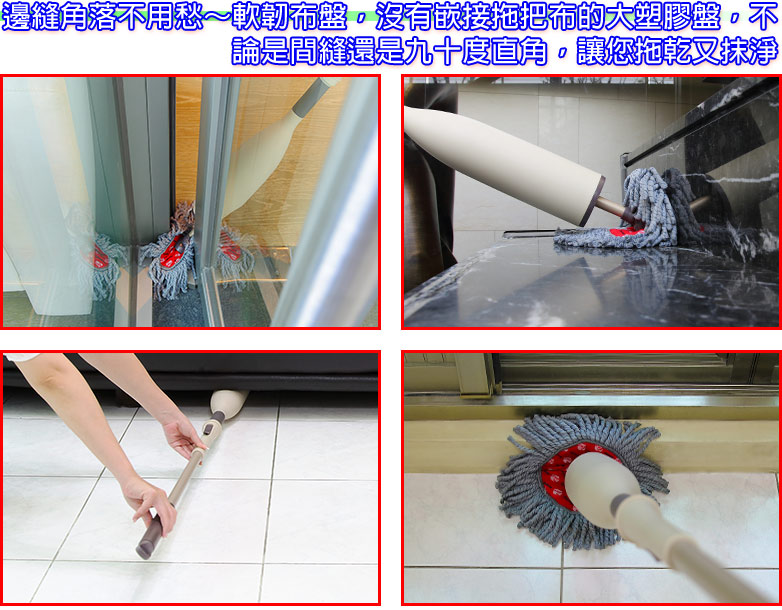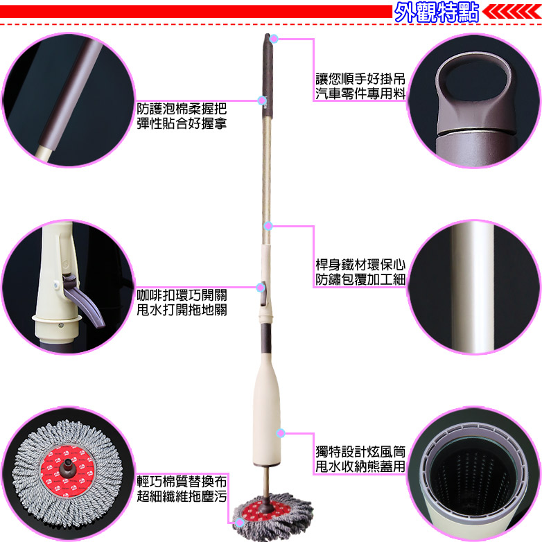 創新概念,結合除塵、拖地、脫水功能設計,免沾手、免提桶、方便又輕鬆離心力甩水原理設計,可自行控制拖把乾濕度,一把在手,即可輕鬆拖地桿身加長,輕鬆省力,方便使用拖把布可以替換,幫您省下桿子的費用