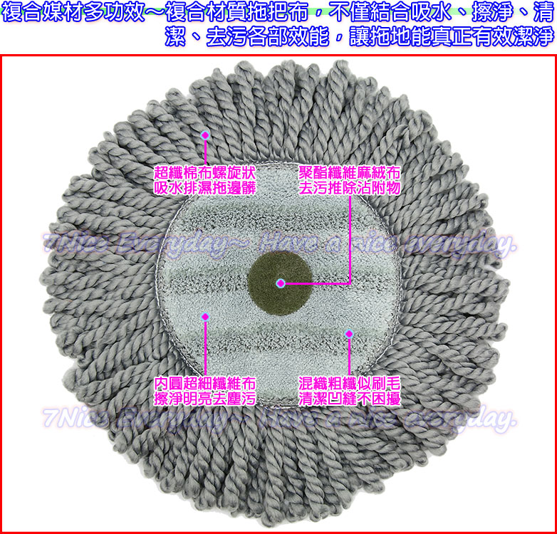 拖把主體:材質:PP、鐵、鉚釘、TPR拖把布:材質:牛津布、海棉、尼龍纖維、超細纖維、超纖棉布、聚酯纖維、TPR