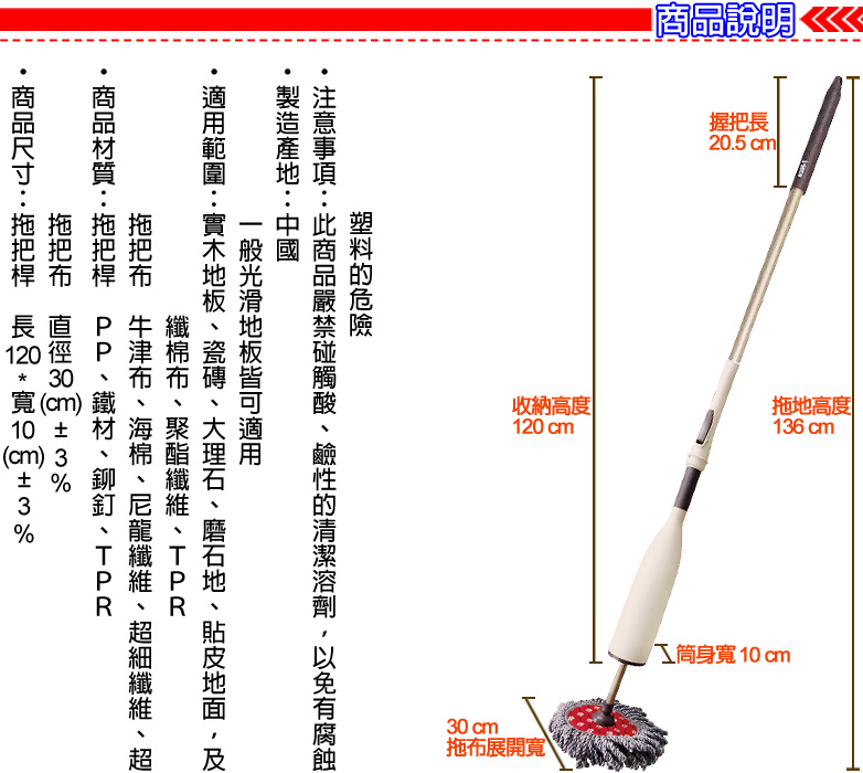 拖把主體:長120cm x寬10cm 。拖把布:直徑30 cm。