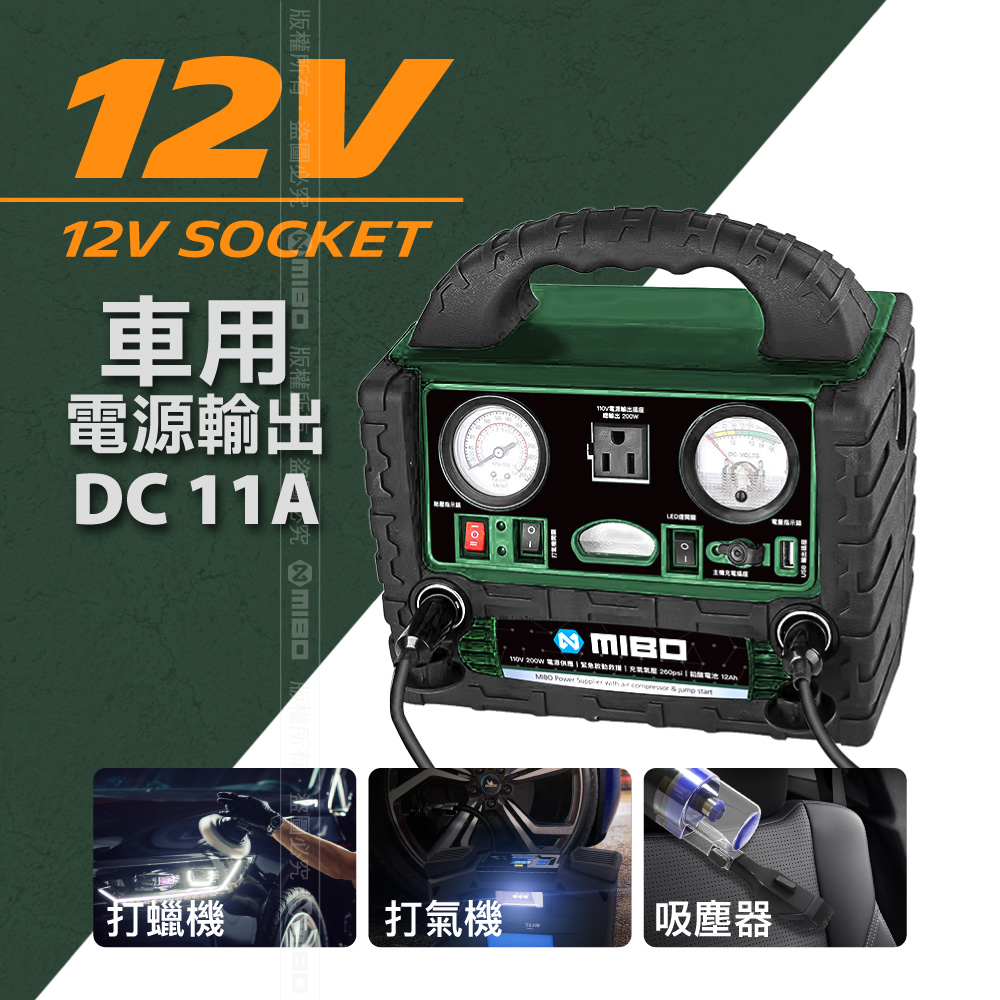 👍110V插座、緊急照明、汽車緊急發動、車用打氣機、USB電源輸出、12V電源輸出。