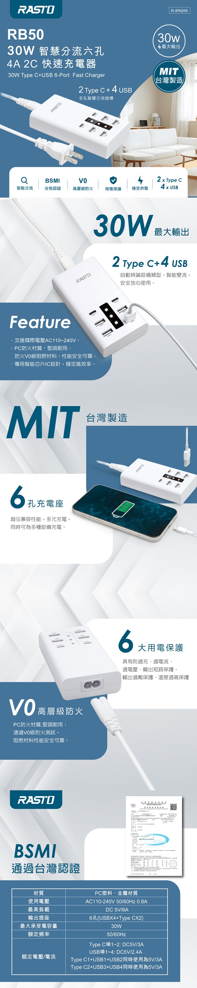 .4孔USB及2孔Type C自動辨識設備類型,智能變流,安全放心使用