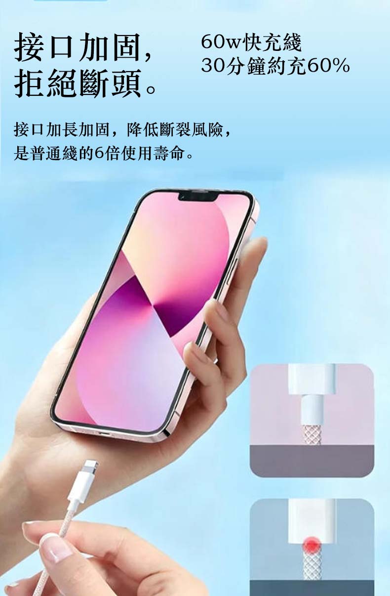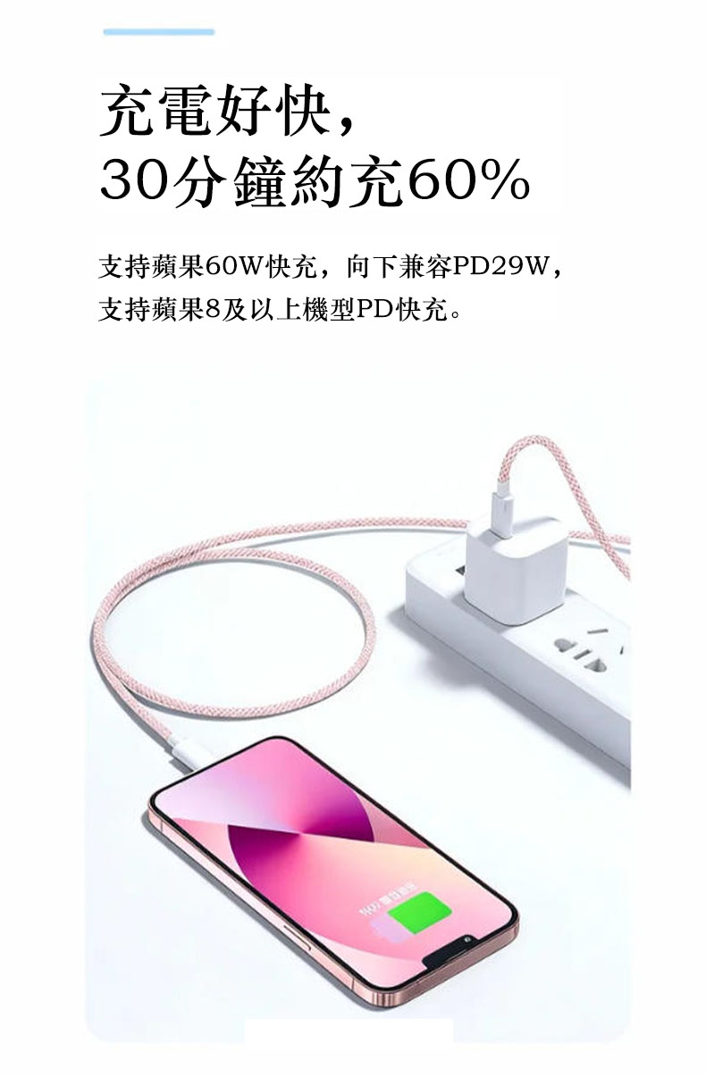 同級首選耐用標杆|快充 + 耐用雙頂配不只快充、更耐用,我們的充電線直接成為同級耐用與效率的雙標杆:⚡ 60W PD/QC 雙協議疾速快充🧵 高密編織耐用材質📏 1m 自由長距體驗🎨 多色可選(多色顏值款)⚡ 疾速快充 + 同步傳輸|效率直接拉滿支援 PD/QC 雙快充協議,30 分鐘約充設備 60% 電量;同時支援充電 + 數據傳輸,速度達 480Mbps,充電、傳文件同步進行,不用再分先後。全機型適配:支援iPhone/華爲/小米等Type-C接口(PD 快充)接口設備,不挑機、插即充。✨高密編織耐用王|壽命是普通線的 6 倍採用高密編織工藝,耐磨防刮、抗弯折性遠超普通塑膠線;反覆彎折不易斷裂、日常磨損不易破損,長期使用依舊穩定耐用,告別「用幾次就壞」的煩惱。📏多色高顏值|體驗與美觀兼備,多色高顏值:多種清新顏色搭配編織紋理,簡約耐看還不易髒,不管搭配手機還是充電寶,都是日常使用的顏值加分項。🔒 安全認證 + 自收納|穩定不踩雷全兼容原廠認證標準,充電穩定不發燙,有效保護設備電池壽命;支援自卷 / 自收納設計,不用時輕鬆整理,告別線體纏繞雜亂。🌟 為什麼幾乎所有使用者都選我們?✅ 60W 快充同級效率最高:疾速充電 + 同步傳輸雙在線✅ 耐用性首選:高密編織壽命是普通線的 6 倍✅ 使用最靈活:1m 距離使用靈活✅ 全機型適配:不挑蘋果 / 安卓設備✅ 長期使用最穩定:不斷線、不發燙、體驗不打折