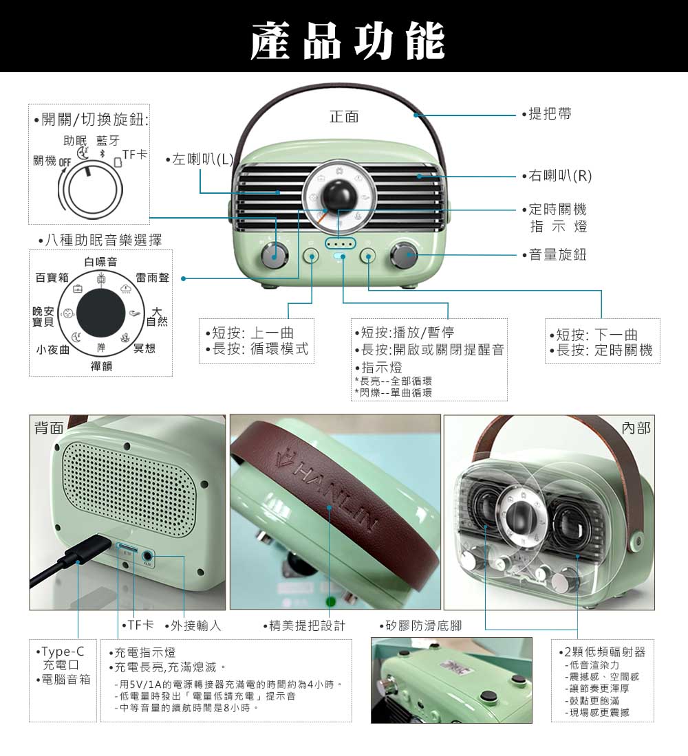 HANLIN-BTF1 復古風藍牙小音響 助眠機 黑色 綠色 素色款 絕美 時尚 木紋 懷舊 手提 無線音響 支持 TF卡 U盤 USB 微型 復古風格 無線 睡前 冥想 茶道 音樂 播放 瑜珈 外出露營 登山 爬山 學生 跳舞 放音樂 聽音樂