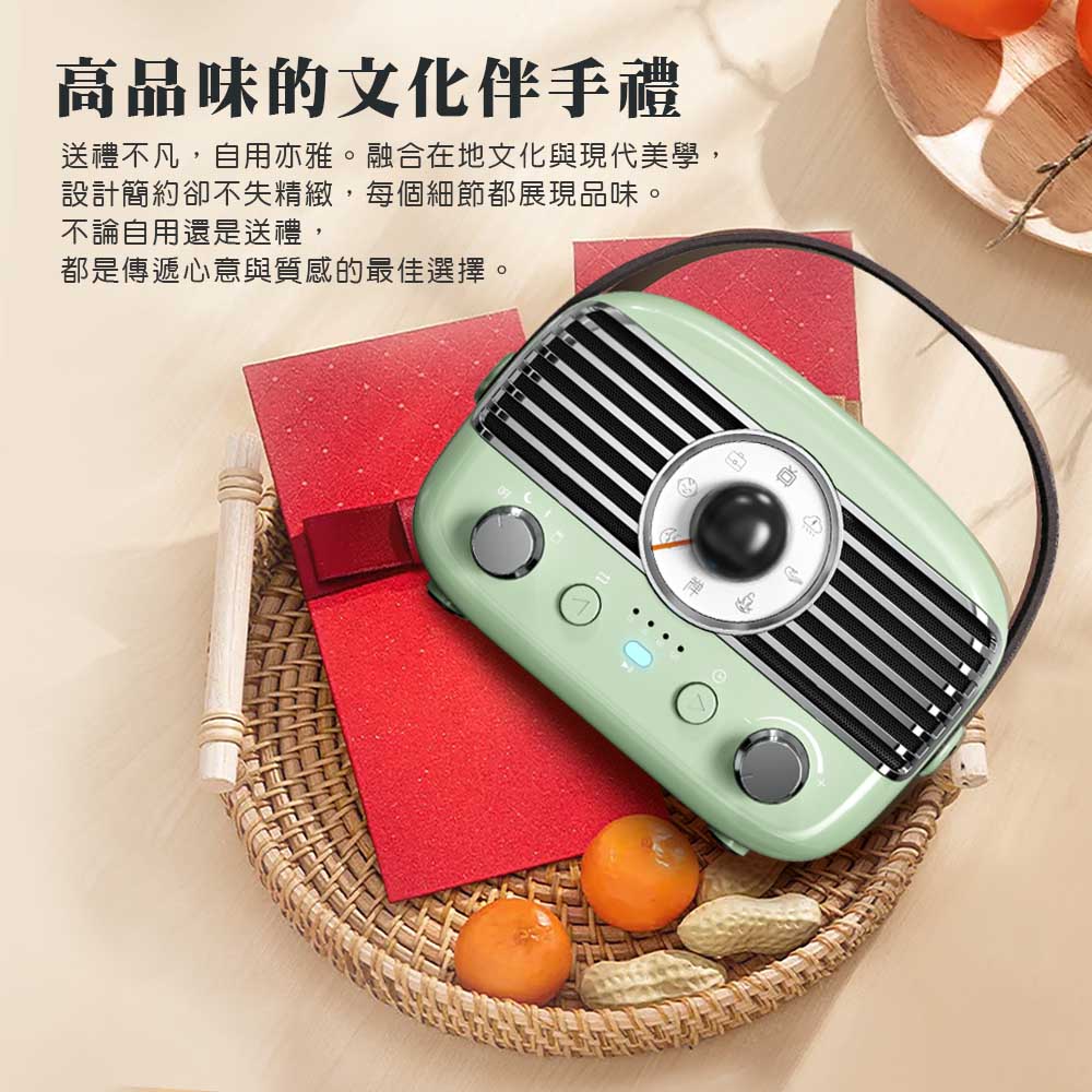 ●經典外型:機身質感有如鋼琴亮面,圓潤機身搭配金屬質感旋鈕,復古又時尚。一台融合復古與現代的便攜藍牙音響,隨時隨地,為生活注入溫柔旋律。