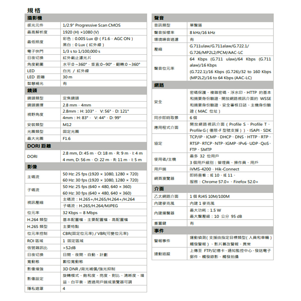 • 200百萬畫素,高品質影像• 支援人員和車輛偵測• 支援智慧雙光,提高安全性• H.265+ 編解碼、高效率壓縮• 內建麥克風 / IP67 防護等級