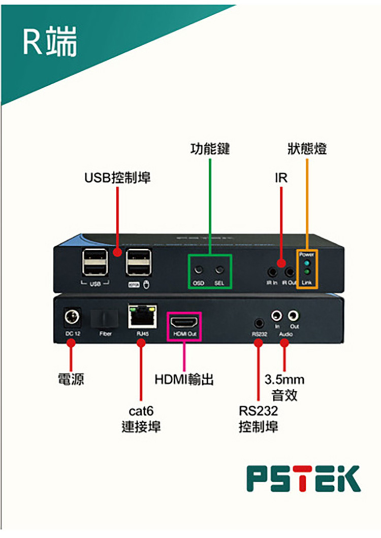 •支援雙向IR紅外線延長傳輸功能,顯示端可橋接傳送端的遙控設備。(發射模組需另購),IR紅外線傳輸適用於各種具有標準紅外線感應的設備。例如:液晶電視,藍光DVD播放機、多媒體播放機、HDMI切換器(IR)、DVR數位錄影機、MOD、紅外線簡報筆…等遙控設備延伸應用)
