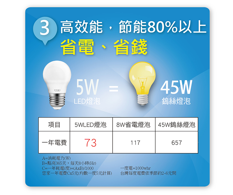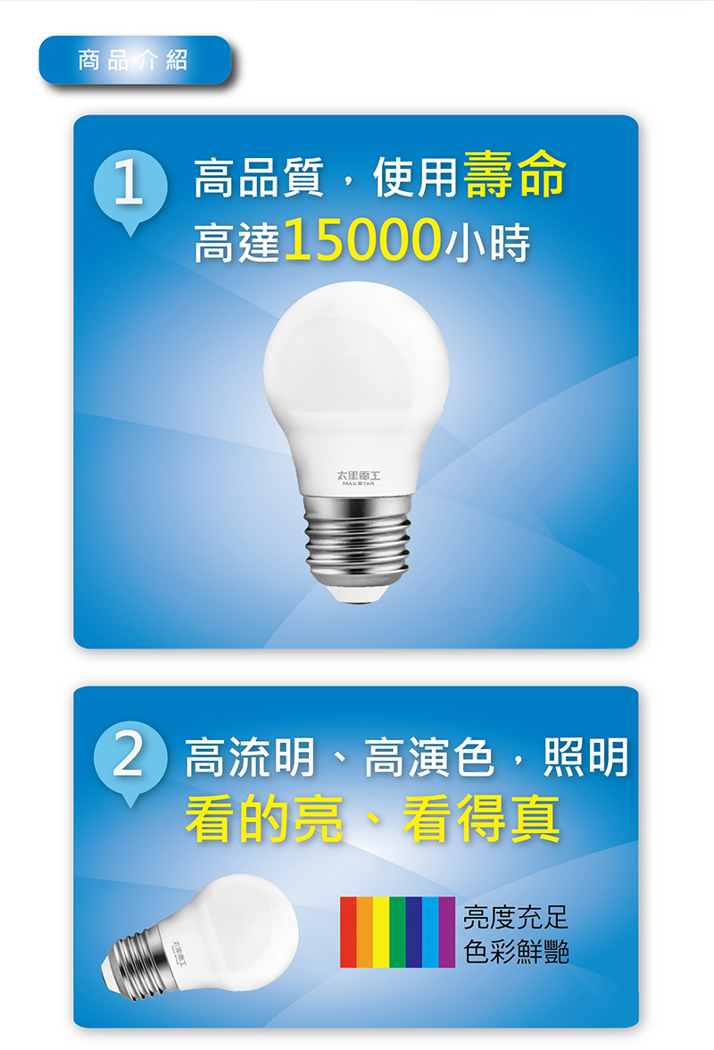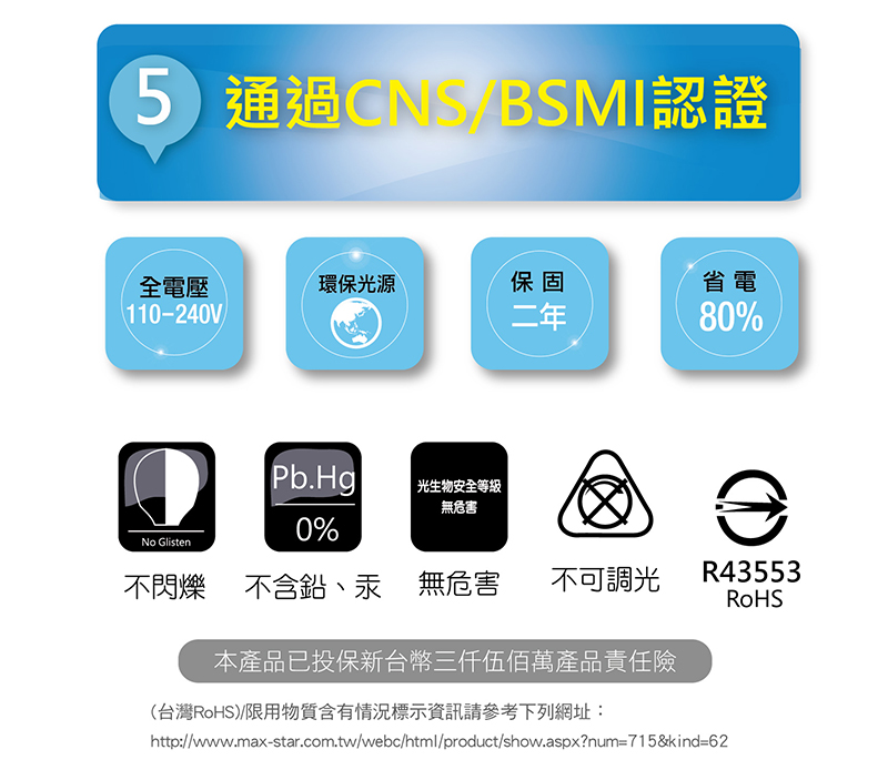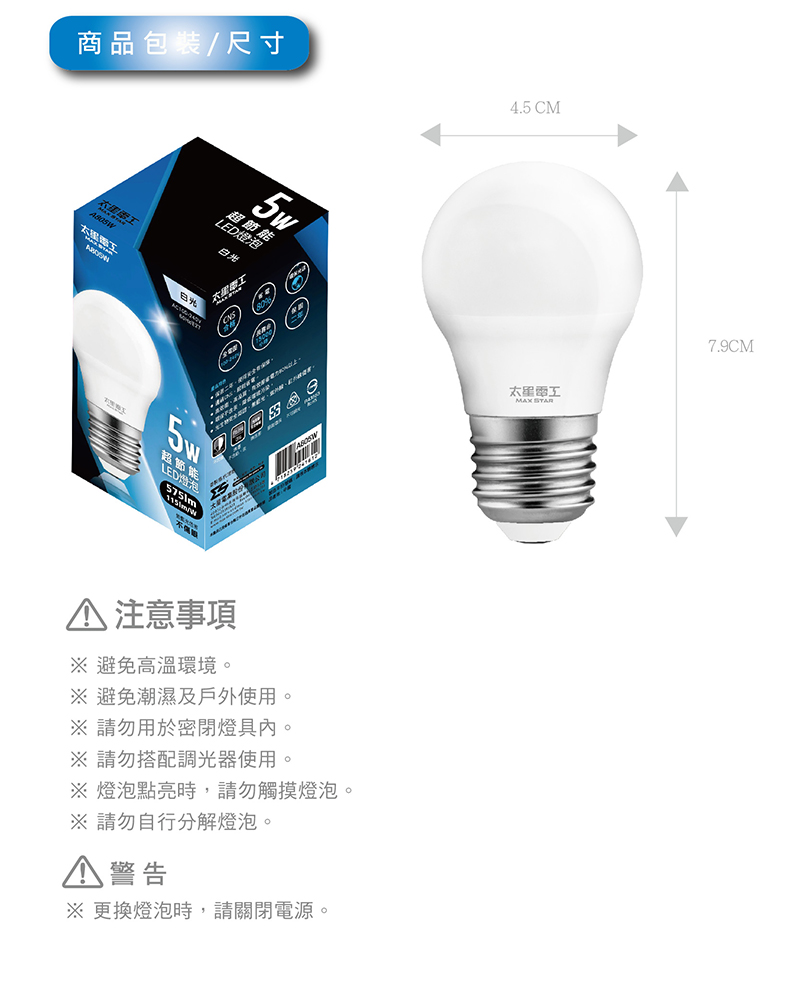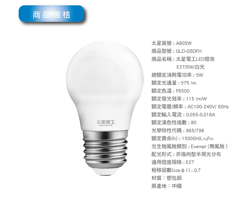 ◆商品特色1、保固二年,使用安全有保障。2、通過CNS,節能省電。3、高效能、高品質,有效節省電力80%以上。4、符合RoHS,環保不含汞,降低環境污染。5、光生物安全認證,無藍光、紫外線、紅外線傷害。6、全電壓,適用AC100-240V電壓。7、本產品已投保新台幣三仟伍佰萬產品責任險。◆商品規格與尺寸商品尺寸:(高)9.6x(寬)5x(深)5/公分包裝尺寸:(高)9.6x(寬)5x(深)5/公分商品重量:0.038kg包裝重量:0.050kg光源規格:白光商品型號:GLD-G05DFE驗證登錄:R43553 RoHS總額定消耗電功率:5W額定光通量:525 lm額定色溫:F6500額定發光效率:105 lm/W額定電壓/頻率:AC100~240V/60Hz額定輸入電流:0.013~0.051A額定演色性指數:80光學特性代碼:865/ 7+7+ 8額定壽命(h):15000H/L70,F50光生物風險類別:Exempt(無風險)配光型式:非指向型半周光分布相移因數(cosφ1):0.60材質:塑包鋁燈座規格:E27產地:中國入數:6入◆注意事項1.避免高溫環境。2.避免潮濕及戶外使用。3.請勿用於密閉燈具內。4.請勿搭配調光器使用。5.燈泡點亮時,請勿觸摸燈泡。6.請勿自行分解燈泡。7.更換燈泡時,請關閉電源。