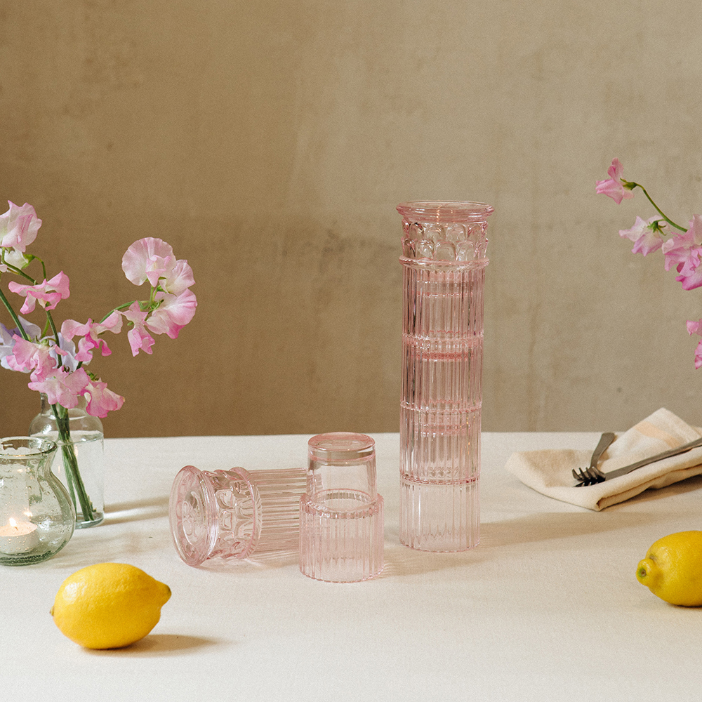 一組四入,堆疊起來成為希臘經典的多克立柱材質: 玻璃顏色: 粉尺寸: 9*9*29公分包裝: 紙盒注意事項: 可放入洗碗機使用。微波爐則因各家廠牌增溫程度不同,使用時請務必留意溫差,短時間溫差避免大於50ºC,若不確定微波爐升溫速度,建議勿嘗試。勿使用電鍋加熱
