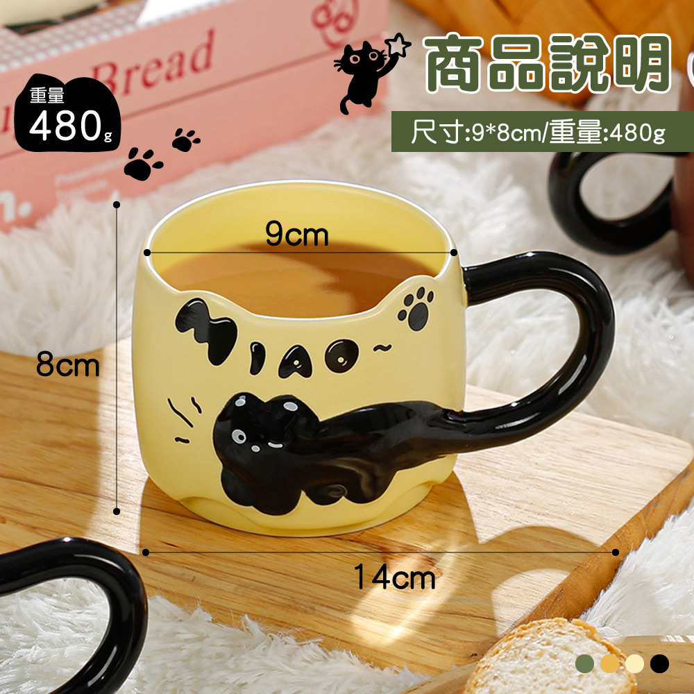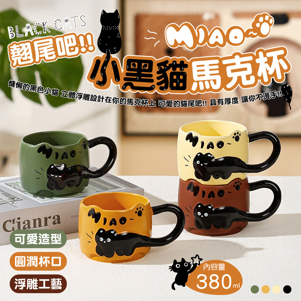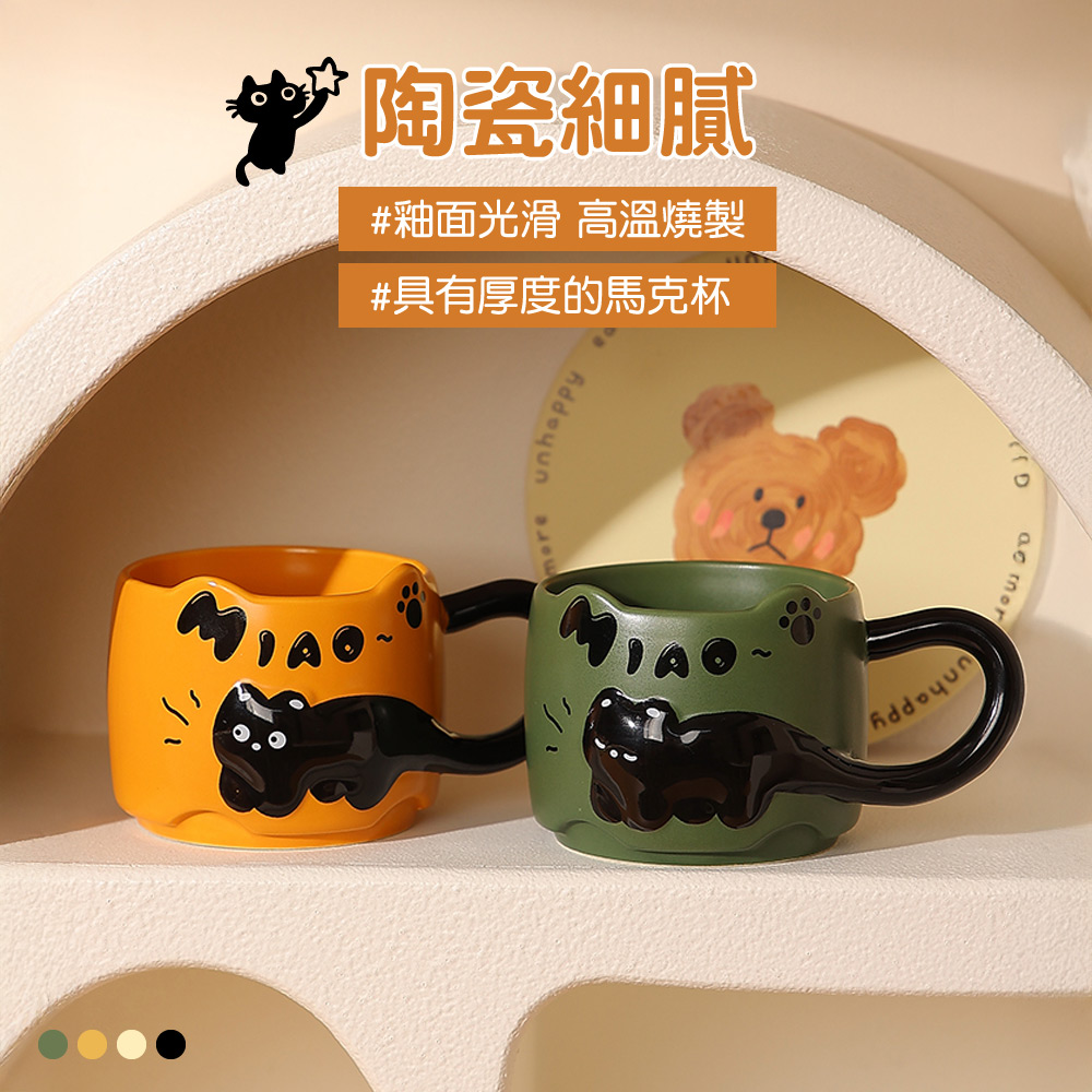🐱 翹尾吧小黑貓馬克杯 ✨精選四色:驚嚇木質棕/往前看向日葵黃/魅力果香黃/熟睡森林綠商品規格:📏 尺寸:9x8cm⚖️ 容量:380ml🏷️ 重量:約480g特色設計:立體翹尾造型,搭配MIAO(喵)字樣加寬手柄,隔熱防燙好拿握底部防滑設計,放置更穩固高溫燒製,瓷質細膩光滑可愛浮雕工藝,不褪色耐用貼心提醒:食品級安全材質,可直接飲用適合熱飲、冷飲使用可放入洗碗機清洗送禮自用兩相宜一起和療癒小黑貓享受午茶時光吧!☕️