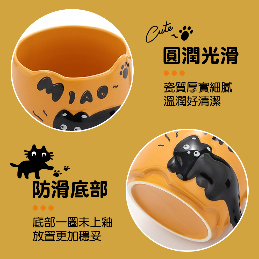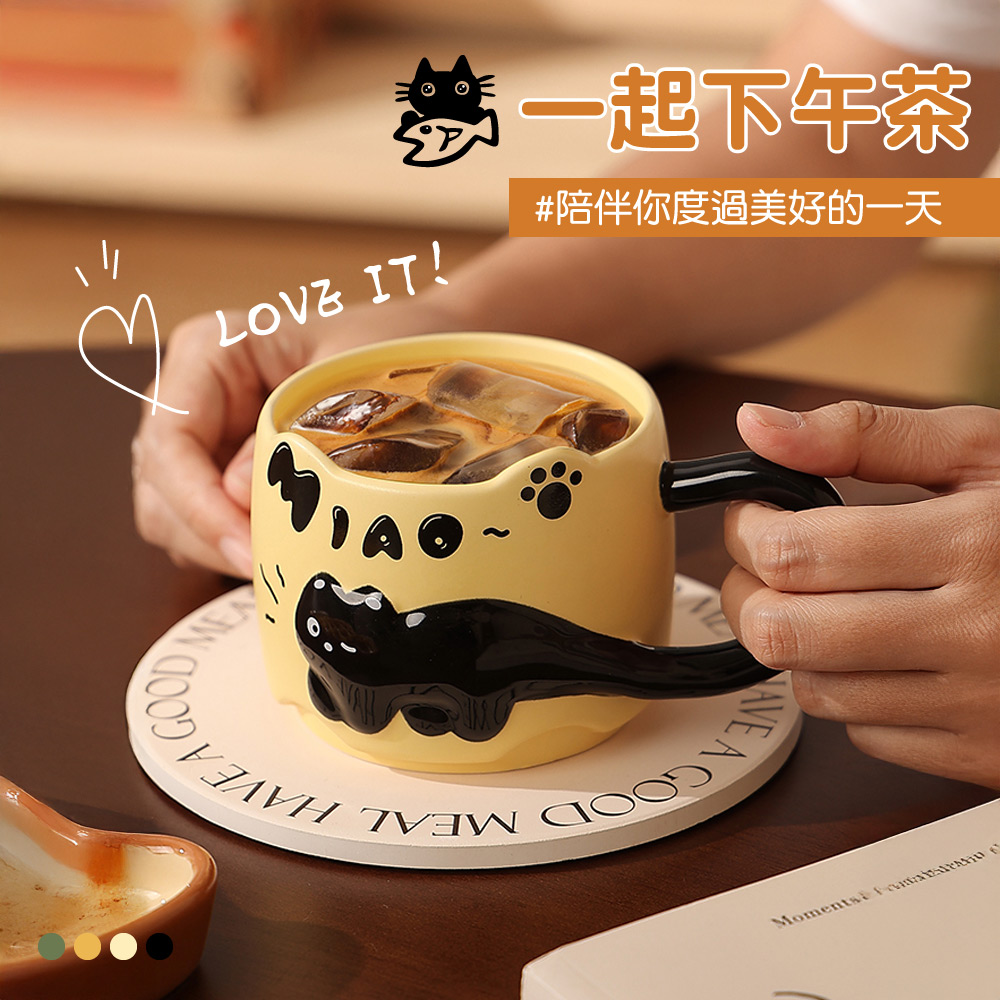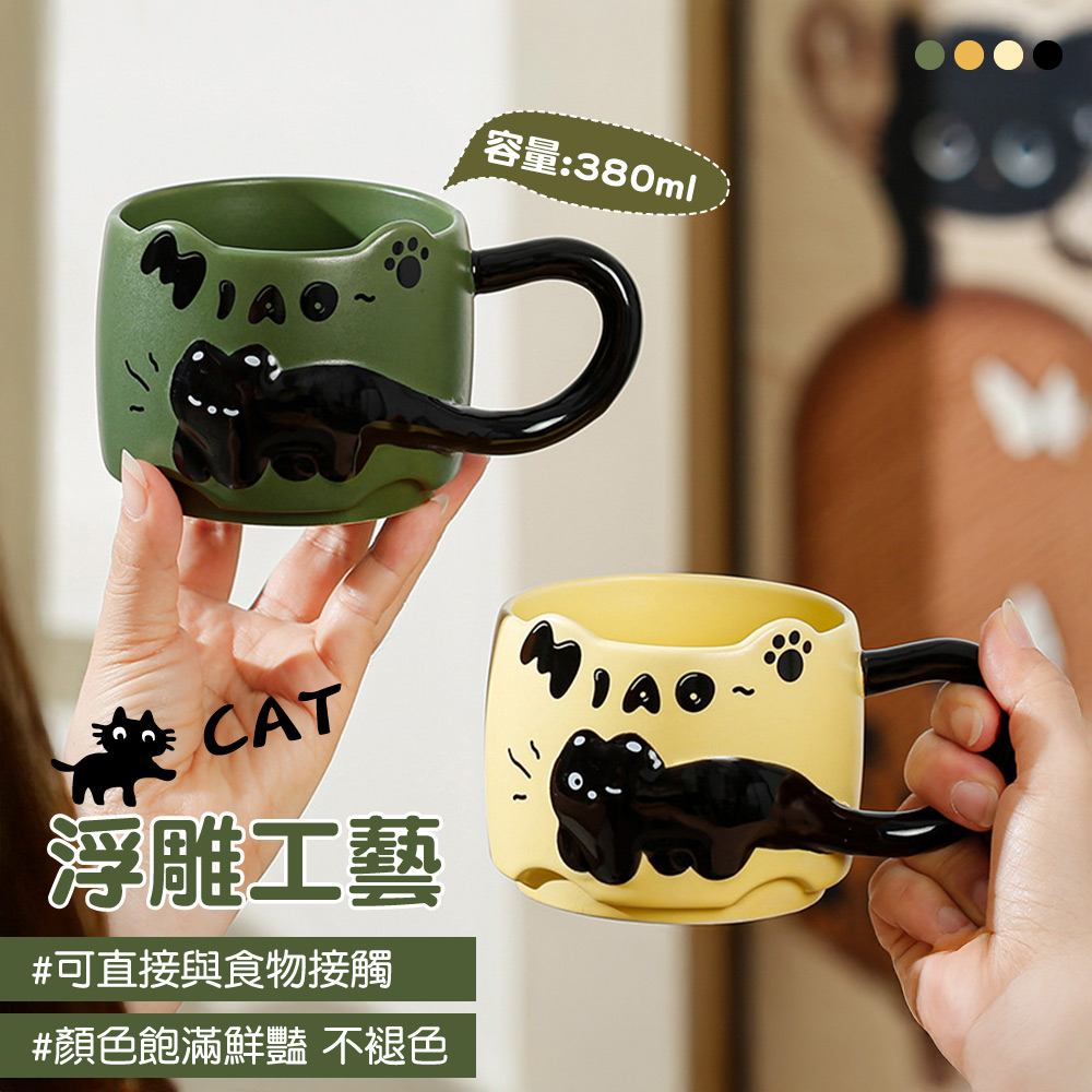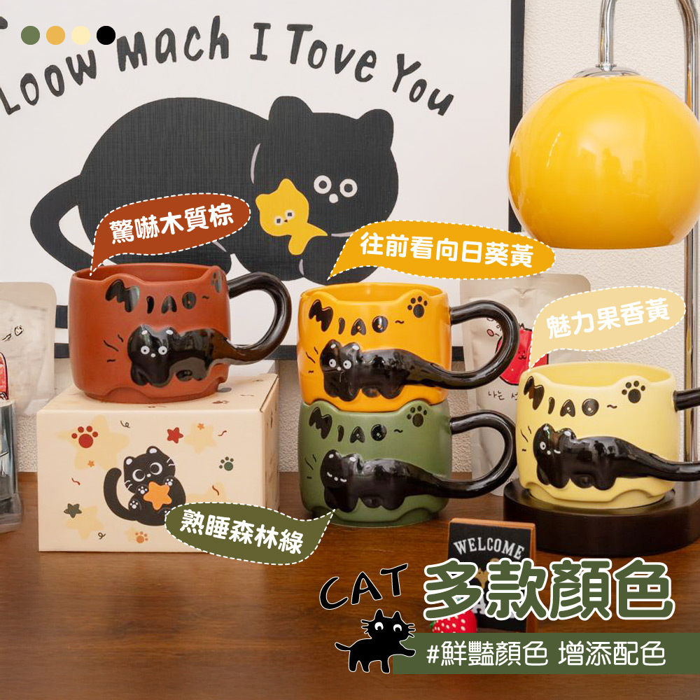 🐱 翹尾吧小黑貓馬克杯 ✨精選四色:驚嚇木質棕/往前看向日葵黃/魅力果香黃/熟睡森林綠商品規格:📏 尺寸:9x8cm⚖️ 容量:380ml🏷️ 重量:約480g特色設計:立體翹尾造型,搭配MIAO(喵)字樣加寬手柄,隔熱防燙好拿握底部防滑設計,放置更穩固高溫燒製,瓷質細膩光滑可愛浮雕工藝,不褪色耐用貼心提醒:食品級安全材質,可直接飲用適合熱飲、冷飲使用可放入洗碗機清洗送禮自用兩相宜一起和療癒小黑貓享受午茶時光吧!☕️