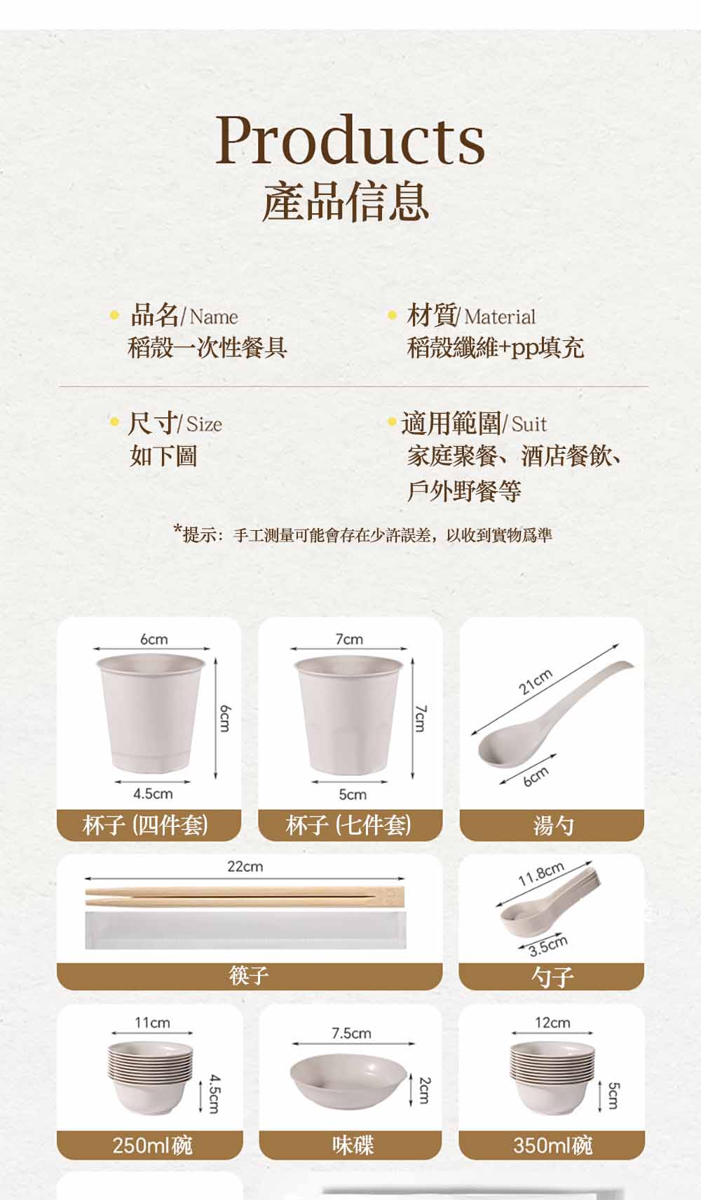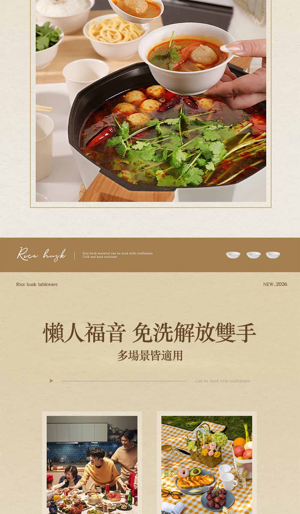 【食品級稻殼・環保可降解碗筷套裝】食品級稻殼碗筷套裝新款環保可降解餐具家用野餐一次性餐盒(稻殼餐具 環保碗筷 野餐餐具 家用一次性碗)榮登野餐 / 聚餐必備清單|健康無異味・用完即扔零負擔・環保人士首選🎁🏆 食品級稻殼材質 × 可降解環保工藝🏆 加厚防燙設計 × 防油防水不滲漏🏆 多場景适配 × 一人食 / 多人餐都好用✨ 為什麼數百萬網友都瘋搶這款碗筷套裝?🔝 健康天花板採用食品級稻殼壓製而成,無塑膠、無蠟、無異味,盛熱湯、裝油膩食物都安心,孕嬰家庭也能放心用,完全不是廉價塑膠餐具可比。🌿 環保可降解,用完無負擔使用後可自然降解,丟棄後不會污染環境,戶外野餐、露營不用帶笨重的洗潔精,用完即扔更省心,讓你享受美食的同時守護自然。💪 加厚耐用不軟塌加厚材質設計,盛熱湯、裝硬菜都不會軟塌變形;防油防水塗層,湯汁不會滲漏,不用擔心弄髒餐桌或手機,聚餐體驗更順暢。🎨 原生稻殼紋理,質感滿分保留稻殼原生細膩紋理,霧面質感高級不顯廉價,搭配米白色調,放在野餐墊或餐桌上都能提升氛圍感,拍照出片率 100%。🎯 誰最適合這款碗筷套裝?✅ 戶外野餐 / 露營:輕量便攜,用完即扔不洗碗✅ 家庭聚餐 / 派對:不用堆積髒碗,飯後收拾零負擔✅ 外賣打包 / 辦公帶飯:乾淨衛生,不用擔心塑膠餐具危害健康✅ 環保愛好者:可降解材質,為地球減輕負擔🎊 現在入手,讓你的聚餐 / 野餐不再有後顧之憂!同價位中最健康、最環保、最耐用的稻殼餐具,數量有限,手慢無!📌 產品規格一次看懂款式:4件套、7件套材質:食品級稻殼纖維+pp填充適用場景:野餐、露營、家庭聚餐、派對、外賣打包產地:PRC(中國台灣監製)#稻殼環保餐具 #可降解一次性碗筷# 食品級健康餐具 #野餐必備餐具# 家用聚餐碗筷 #環保無負擔餐具