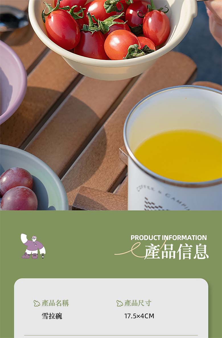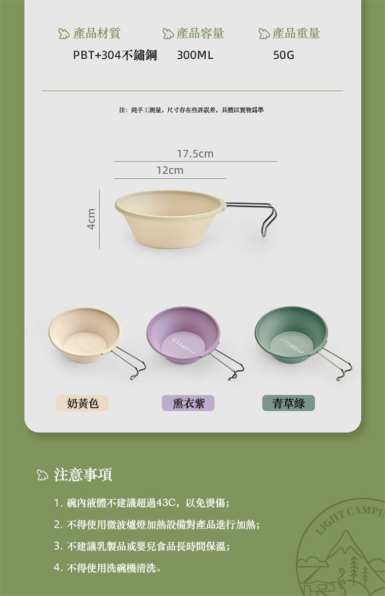 【食品級耐用・露營雪拉碗】食品級加厚露營雪拉碗新款耐高溫可掛式戶外餐具野餐碗(露營餐具 耐熱碗 野餐碗 戶外便攜碗)榮登戶外實用清單|安全無異味・多功能適配・露營黨必備🎁🏆 食品級材質 × 耐高溫防燙🏆 可掛可疊 × 收納零負擔🏆 多功能適配 × 盛湯 / 裝飯 / 當餐盤✨ 為什麼數百萬網友都瘋搶這款雪拉碗?🔝 安全天花板食品級 PBT+304不鏽鋼材質、無雙酚 A,盛熱粥、裝嬰兒輔食都安心,孕嬰家庭也能放心用,完全不是廉價塑膠碗可比。💧 多功能實用性強碗身加深設計,可當湯碗、飯碗,也能反過來當餐盤裝水果、點心;搭配防燙矽膠圈,端熱碗不燙手,戶外煮食更省心。🧩 收納省心不佔空間碗身帶掛孔,可掛在營地掛鈎上;多個碗可嵌套收納,體積縮減 60%,放入露營箱不佔空間,適合裝備繁多的硬核露營者。🎯 誰最適合這款雪拉碗?✅ 硬核露營愛好者:加厚耐摔,適合複雜戶外環境✅ 家庭露營 / 親子戶外:食品級安全,給孩子用更放心✅ 戶外工作者:輕量便攜,隨時補充熱食✅ 野餐愛好者:多功能設計,一碗多用減少裝備🎊 現在入手,讓你的戶外煮食更省心!同價位中最安全、最耐用、最實用的雪拉碗,數量有限,手慢無!📌 產品規格一次看懂款式:3色可選(奶黃色/ 熏衣紫/ 青草綠)× 1 個入材質:食品級 PBT+304不鏽鋼設計:馬卡龍啞光質感 × 可掛式孔位適用場景:露營、野餐、戶外工作、家庭聚餐產地:PRC(中國台灣監製)