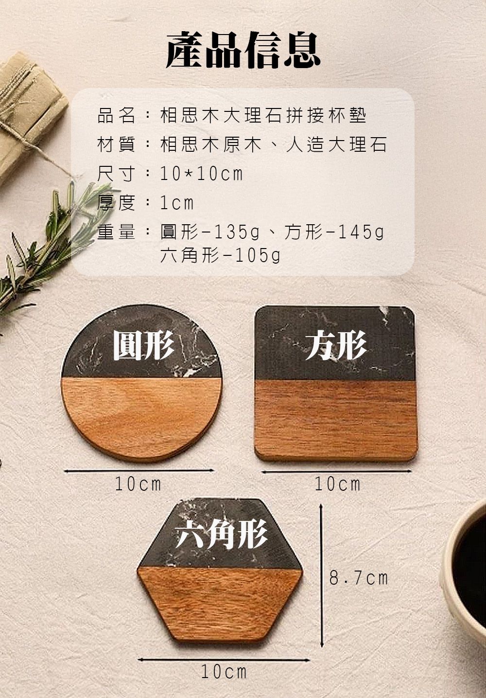 ✨ 質感生活,從這款大理石拼接杯墊開始! ✨精選相思木搭配質感大理石拼接而成,為您的咖啡時光增添獨特品味 🤎溫潤木質搭配細膩石紋,呈現出既現代又溫暖的居家風格。提供黑、白2色,3種幾何造型為你的居家品味增添獨特風格🏡。🔸 特色亮點:✔ 高級拼接工藝 – 簡約設計,提升桌面品味✔ 精緻手感 – 10×10cm大小,1cm厚度,扎實有質感👌✔ 客製化雷射刻字 – 刻上名字、祝福語,打造專屬禮物🎁💖無論是 送禮 或 自用,這款杯墊都是你的質感首選!📌 賣場圖下方加購,擁有獨一無二的刻字杯墊!【產品信息】品名:相思木大理石拼接杯墊材質:相思木原木、人造大理石尺寸:10*10cm厚度:1cm重量:圓形-135g、方形-145g、六角形-105g
