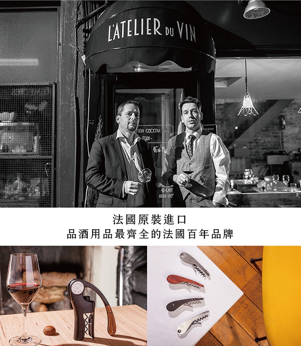 來自法國的 L'Atelier du Vin 創立於 1926 年,家族本身擁有廣大的葡萄園及自有香檳品牌,憑藉著葡萄酒釀造廠的豐富管理經驗,將專業自酒窖延伸至餐桌。研發擁有強烈自我風格,兼具實用性與時尚潮流,更貼近居家消費者需求的酒器類商品。L'Atelier du Vin 擁有全球品項最齊全的葡萄酒、香檳專業周邊商品專賣店的稱號,獨特的專業品牌魅力席捲全球,在法國最知名的拉法葉百貨及巴黎有超過30家分店。