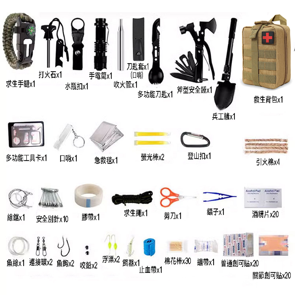 內容物:求生背包x1、兵工鏟x1、求生手鏈x1、打火石x1、水瓶夾x1、手電筒x1、吹風管x1、多功能刀匙x1、傘繩x1、多功能斧型安全錘x1、多功能工具卡x1、求生口哨x1、保暖毯x1、螢光棒x2、D型登山扣x1、引火繩x4、線鋸x1、安全別針x10、傘繩x1、剪刀x1、鑷子x1、釣魚線x1、釣魚轉盤x2、魚鉤x2、鉤重x2、釣魚浮動x2、餌器x1