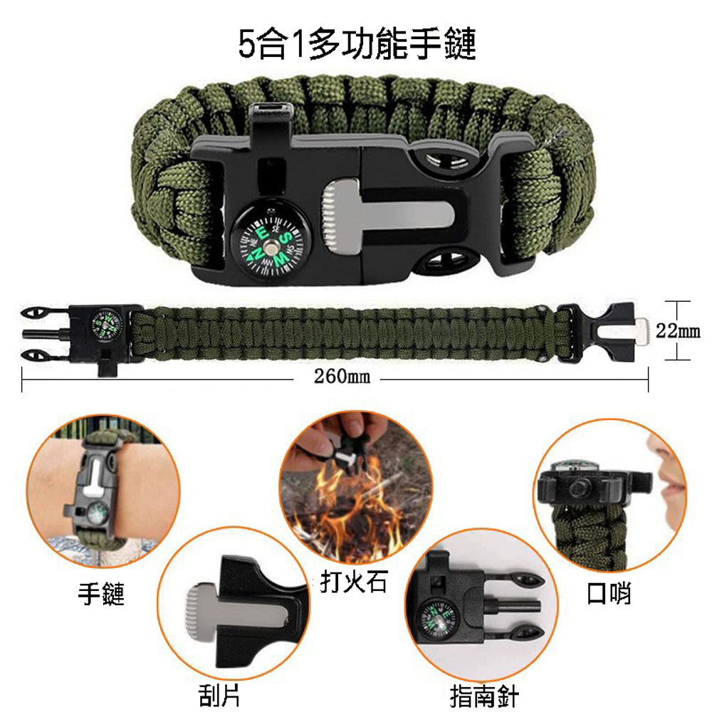 五合一求生手鏈,遂石、指南針、手環、刮片、口哨