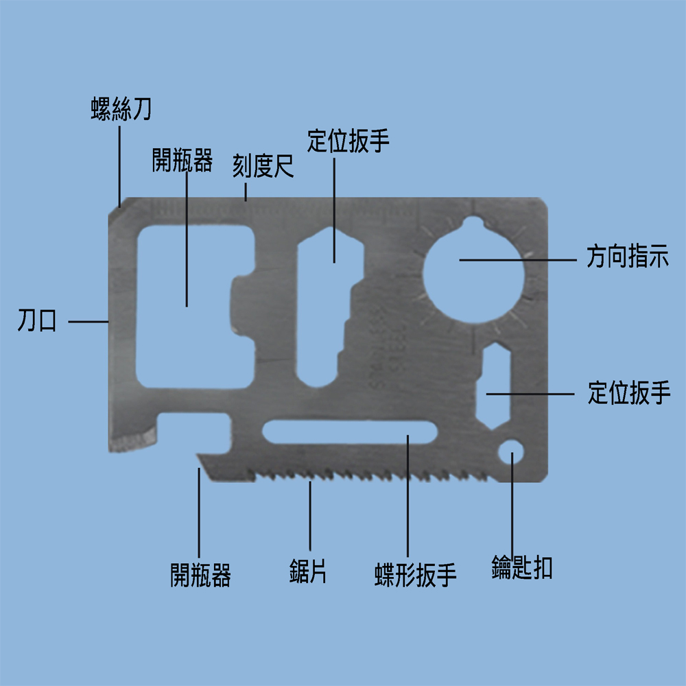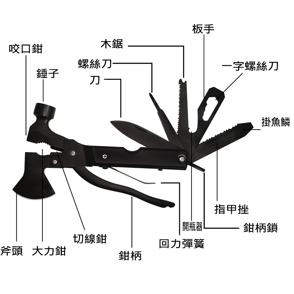 多功能工具刀(含剪刀/鋸子/螺絲起子)、斧頭錘、軍規求生繩,帶有皮質收納套,多功能可切可鋸可開瓶,放皮夾放口袋都適