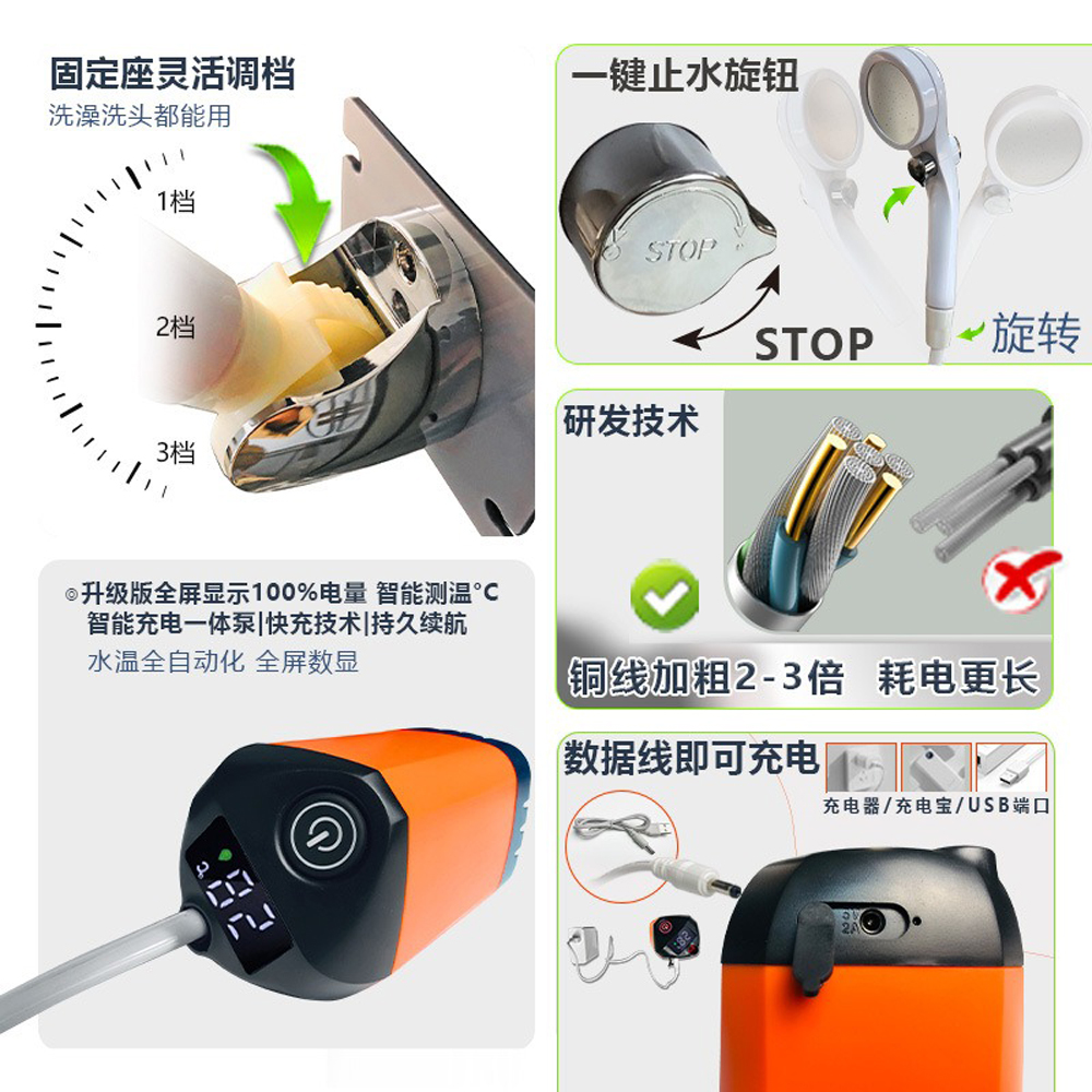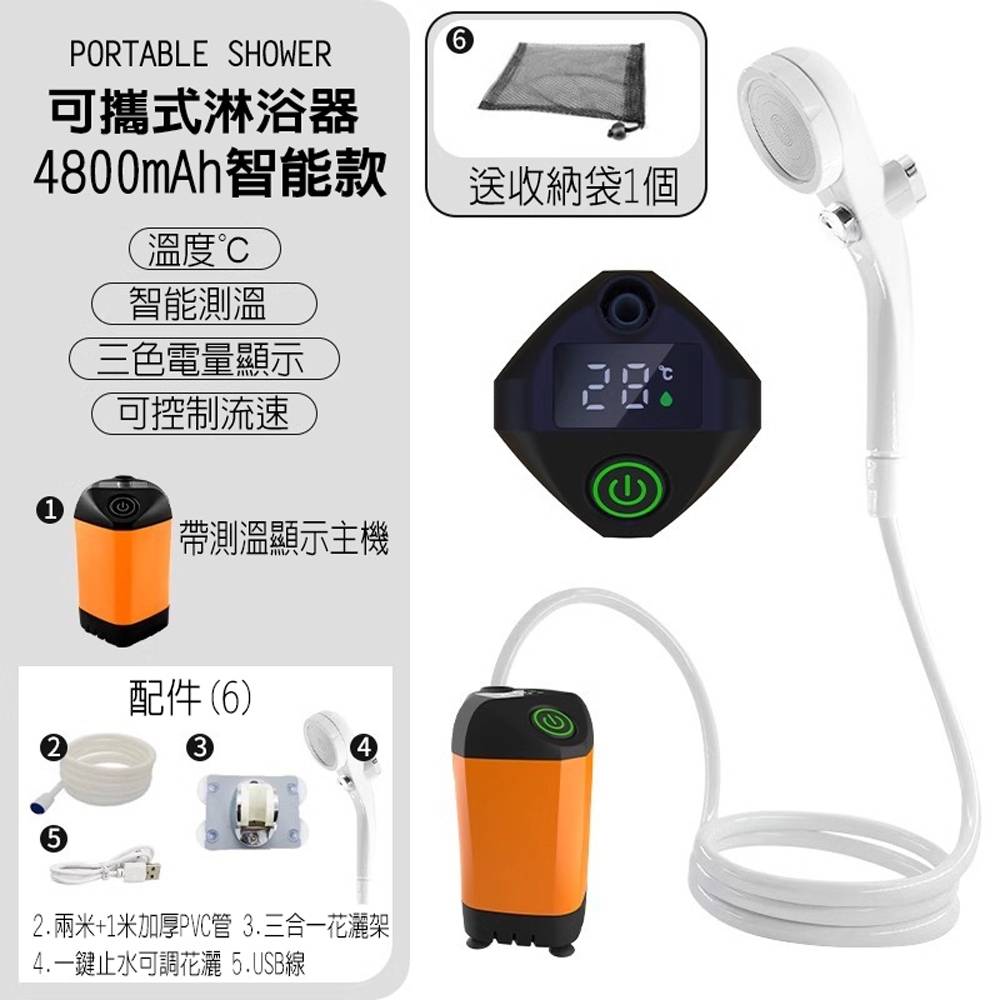 內容物:吸水主機×1、淋浴噴頭×1、2米淋浴管×1、壁掛支架×1、充電線×1、收納袋×1、說明書