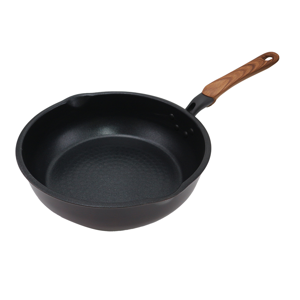 日本製造品質保証,採用合金+日本大金不沾塗層,可用鐵鏟超耐磨超耐用,傳熱快速,導熱更均勻,儲熱性佳,雙引水導角設計不回漏,適用IH電磁爐、紅外線爐、瓦斯爐、電爐、鹵素爐,仿木柄質感溫潤時尚美觀,一鍋多用料理食物好鍋具。 產品特性: 烹煮時將鍋內清洗,加熱後將適當的油順鍋內紋入倒入,煎、煮、炒、炸皆可。 使用柔軟布料或海綿及清潔劑於溫水中清洗,鍋身外則由以醋清洗擦拭即可保持光亮。