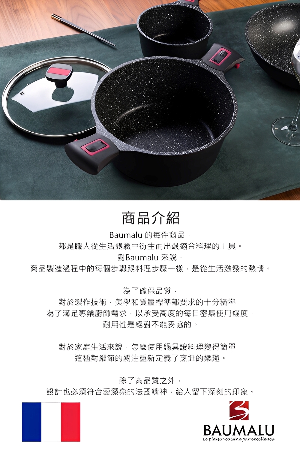 創立於1971年的Baumalu ,起源於法國東部美麗阿爾薩斯地區,位於德法之間的這個地區,Baumalu 有著德國人製作的嚴謹技術,並伴隨著法國悠久的美食傳統。秉持著好料理要用好鍋具襯托的精神,Baumalu 致力於開發各種不同商品,除了為專業廚師打造精美的廚房用具,也為一般家庭生產適合的商品。