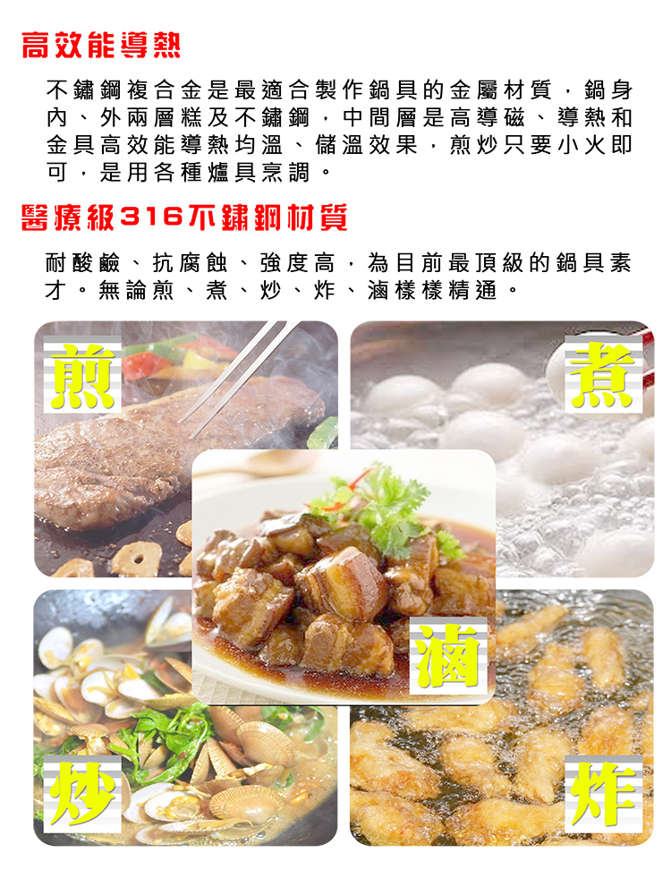 臺灣製造SGS檢驗合格,採用頂級#316不鏽鋼材質,一體成型鍋身附鍋蓋,耐酸鹼耐腐蝕更安全,傳熱快速,導熱更均勻,可當火鍋、湯鍋、料理食物器皿,IH電磁爐對應,瓦斯爐、電爐、紅外線爐、電磁爐通通適用。