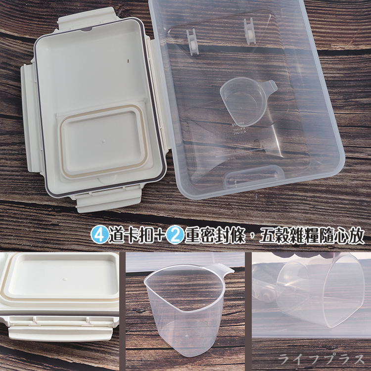 SGS 檢驗合格使用安心,掀蓋式密封上蓋,密封保鮮,附扁平量杯標示設計,4道卡扣+2重密封條,五穀雜糧隨心置放,可當米桶、食物、雜物收納盒,多用途使用,底部滑輪+凹槽手把設計,好拉順手,雅緻巧思,廚房煮飯好幫手。