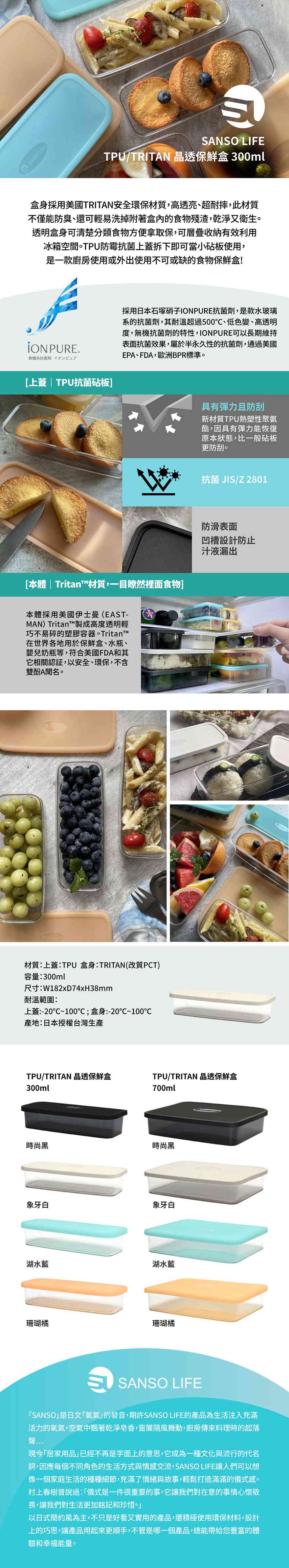 材質:上蓋:TPU (熱塑性聚氨脂),象牙白款另外添加天然米糠殼物。盒身:TRITAN(改質PCT)容量:300ml重量:85g尺寸:W182xD74xH38mm 耐溫範圍:上蓋:-20℃~100℃ ; 盒身:-20℃~100℃產地:日本授權台灣生產