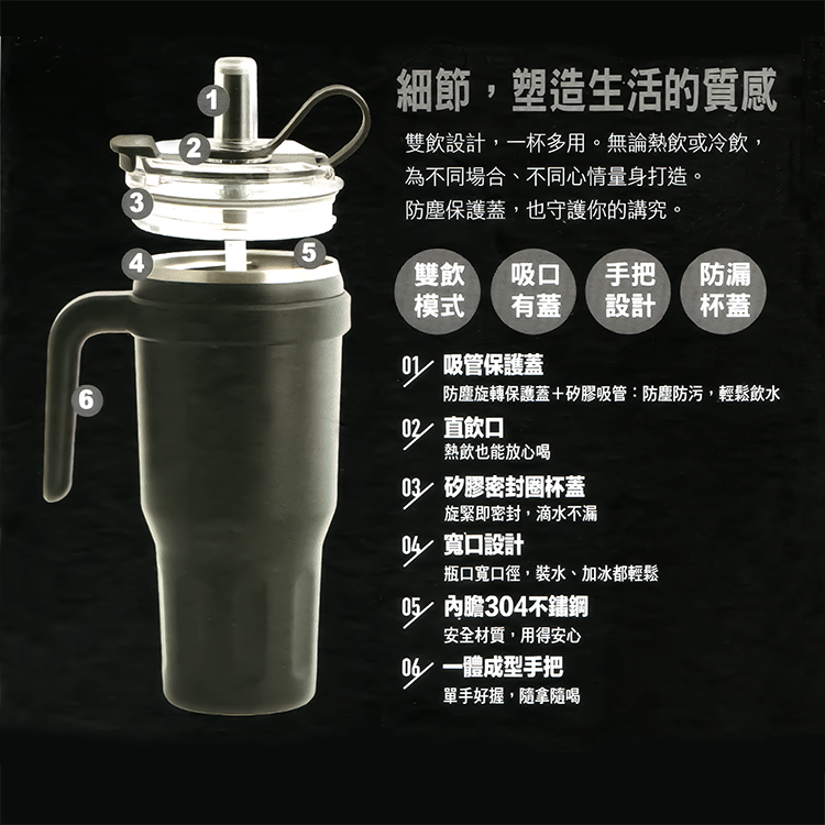 1100ml大容量,滿足全天所需的水分補給,大口徑設計容易清洗,瓶身內層採用304不鏽鋼材質,耐高溫更安全,雙層真空技術,具保冷保溫雙用途,無論是在家裡、上班、上學、野外登山、郊遊旅行皆適用,造型優美時尚,輕巧手把,方便攜帶,輕鬆帶出門,直飲口+吸管口,獨特的雙飲口設計,讓您可以隨時隨地享受熱飲或冷飲。