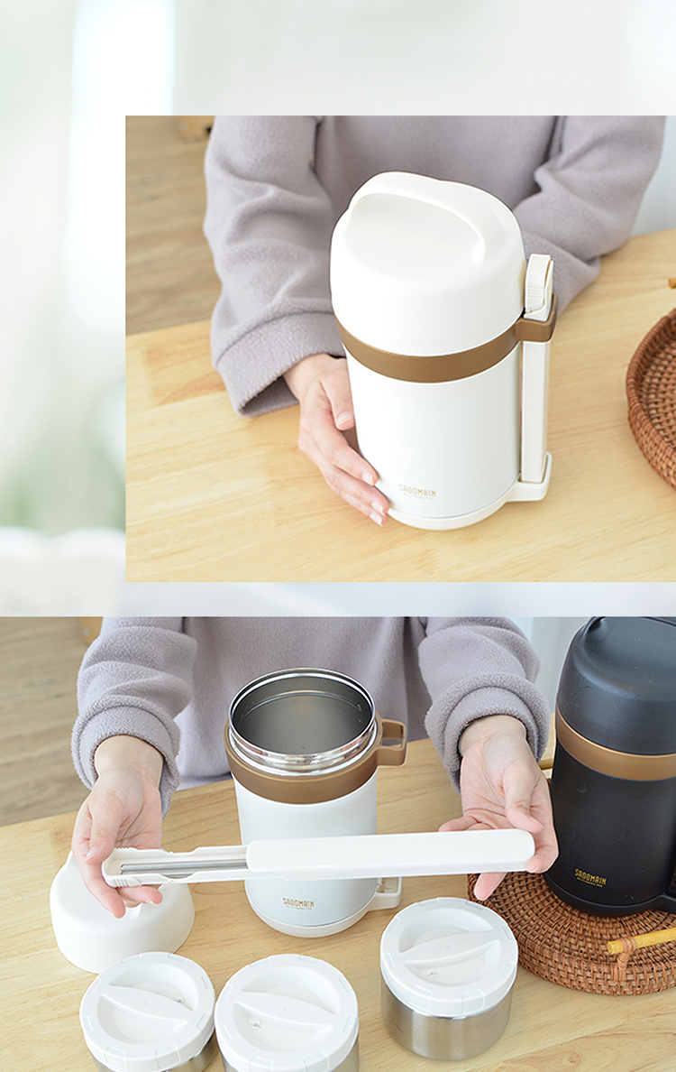 時尚設計,雅緻巧思美觀大方,內層採用316高級不鏽鋼材質,耐酸鹼抗腐蝕耐高溫,外層採用304不鏽鋼材質,抽真空保溫保冷技術,保溫保冷效果長,儲熱性佳,外部噴粉塗裝,防滑耐磨不掉漆,絕佳觸感,底部止滑設計,不易滑動,不怕刮傷,堅固耐用容易清洗,附分裝盒三層設計可飯菜湯分離,流線把手提感極佳,打開盒蓋方便,附304不鏽鋼環保筷組,不需另帶餐具,美味料理輕鬆帶出門。室溫25°C,裝入98°C熱水後,保溫效果8小時81.7°C以上。