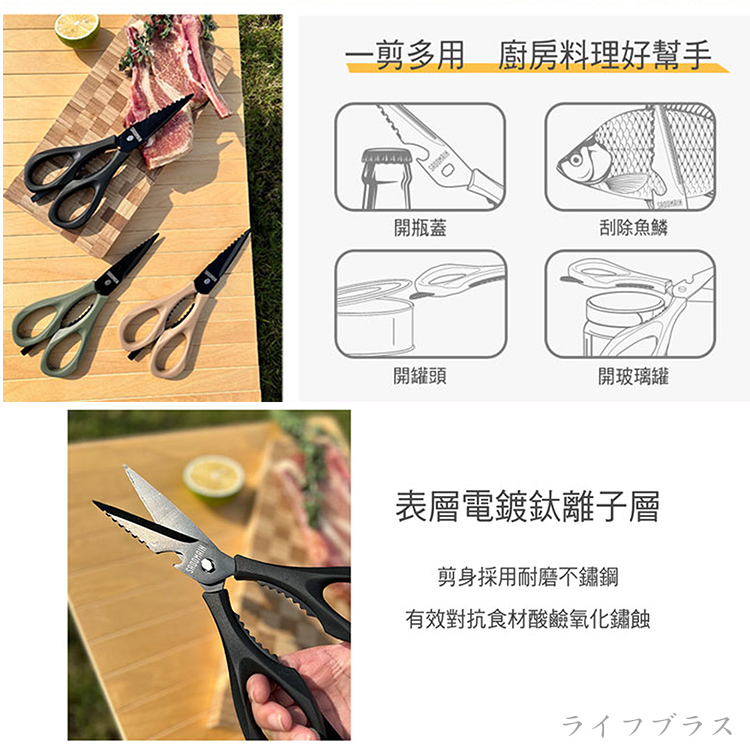 刀匠工藝厚刀2.5mm,更加鋒利,鋒利好剪,使用壽命更長,不鏽鋼鍍鈦耐磨性更高,有效防止腐蝕性原料,廚房露營料理好幫手,輕輕鬆鬆將各種食材分段不費力。
