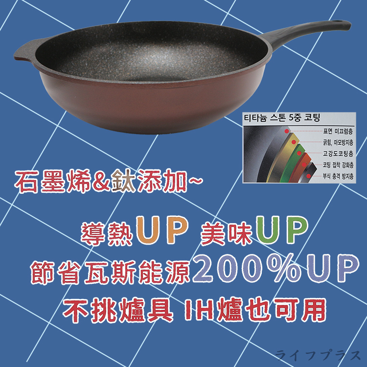 韓國製造品質保証,採用最新輕量合金精工製作,採用石墨烯+鈦不沾塗層耐用不沾處理,煎煮食材只需少許油,達到不沾,一體成形鍋內無鉚釘設計 ,易清洗,傳熱快且均勻,省油,省瓦斯,料理食物好鍋具,適用IH電磁爐、紅外線爐、瓦斯爐、電爐、鹵素爐。