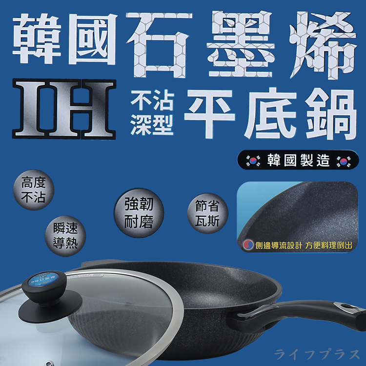 韓國製造品質安心,採用最新合金精工製作,採用石墨烯不沾塗層耐用不沾處理,導熱更均勻,煎煮食材只需少許油,達到不沾鍋身抗黏OK,不易粘黏食材,易清洗 ,傳熱快且均勻,省油,省瓦斯,深型化設計料理食物好鍋具,超厚導磁適用IH電磁爐、瓦斯爐、電爐、紅外線爐、鹵素爐,不挑爐的好鍋。