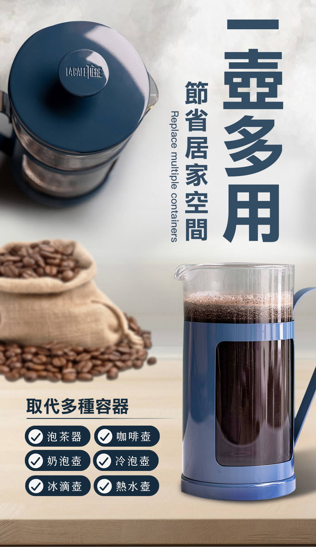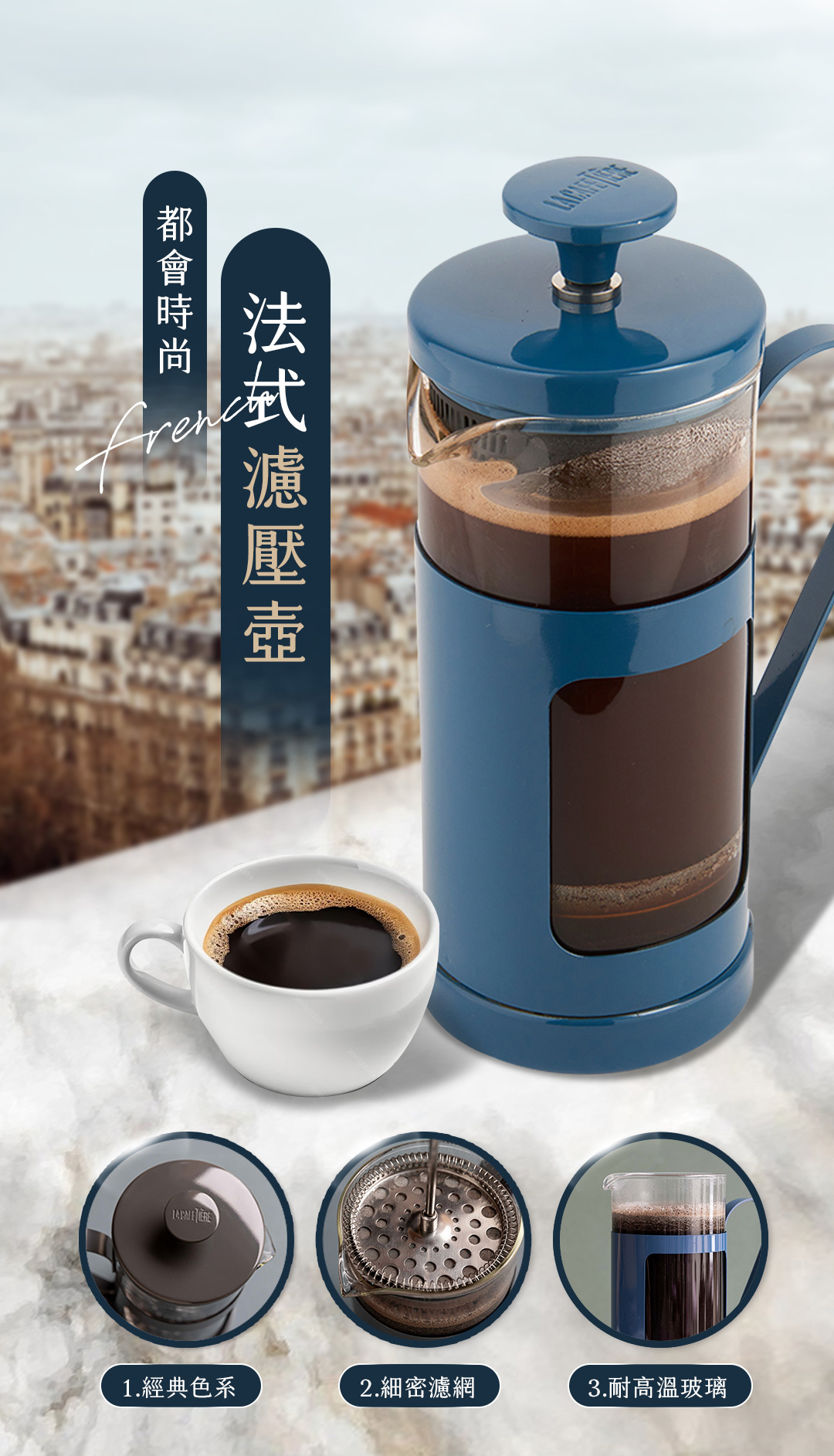 先倒入研磨後的咖啡粉或茶葉至壺中,接著注入熱水而後將濾壓器調整到壺蓋頂端,靜置約 3~5 分鐘,再輕輕下壓濾壓器細密濾網使咖啡粉沉澱壺底,讓您盡情享受咖啡香氣玻璃杯可拆卸,方便清潔注意事項:1. 本商品一件入 (附咖啡匙、備用濾網);容量約 1000 ml2. 玻璃杯適用洗碗機,其它配件僅適用手洗清潔並搭配柔軟的海綿,皆請保持乾燥3. 適用中粗度研磨的咖啡豆、花草茶、東方茶葉;注入的熱水請與上蓋保持至少 2.5 cm 之距離4. 進口商品無維修服務;商品尺寸可能因人工測量而略有誤差。 品牌:英國 La Cafetiere 材質:硼矽玻璃、304 不鏽鋼 (內部)