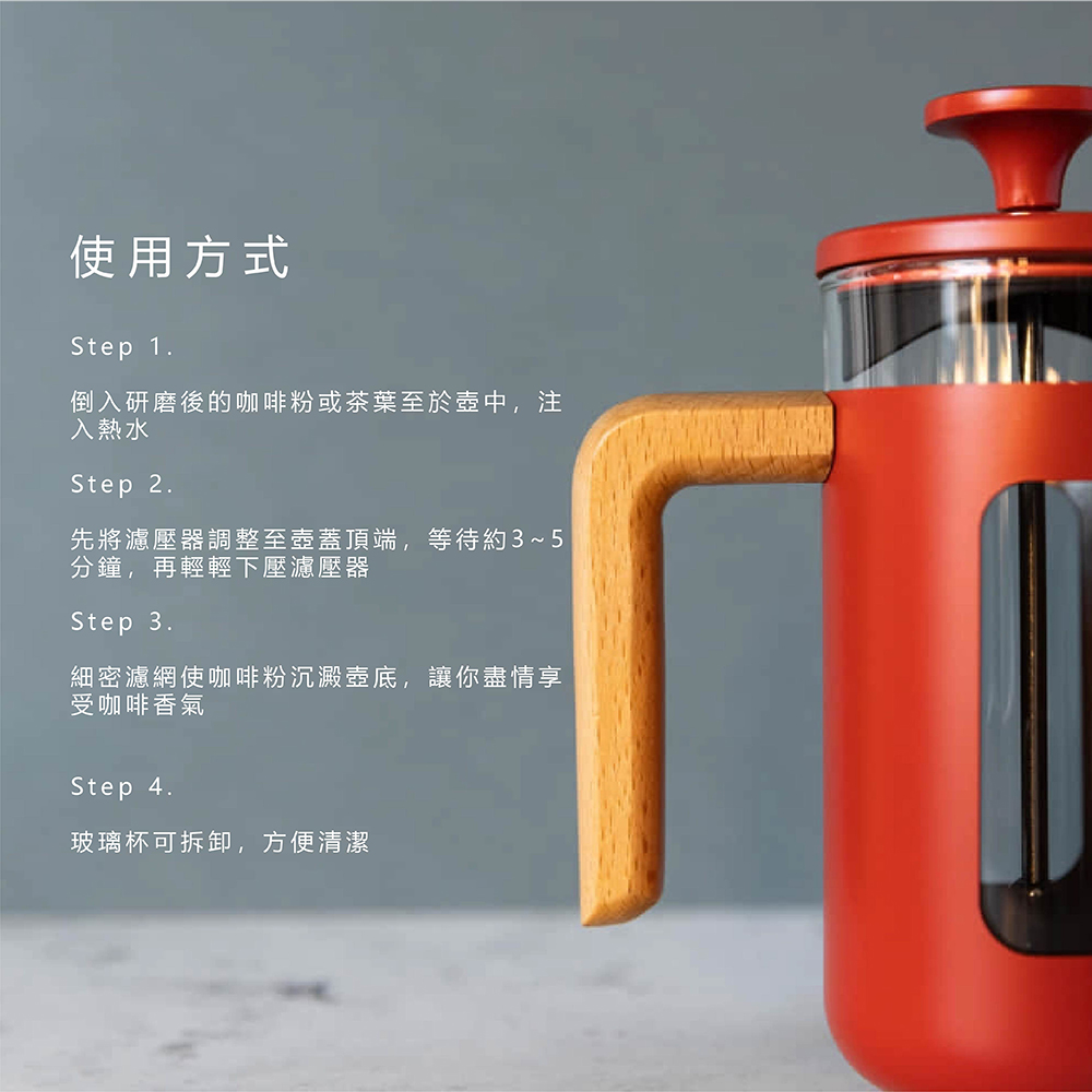 大小容量:大容量為1000 毫升,小容量為350毫升充分利用:易於使用、時尚的濾壓壺享受法式壓榨咖啡、茶葉,兩用便利超細濾網:可重複使用的不銹鋼濾網可鎖住咖啡渣及茶葉,同時讓咖啡跟茶口感順滑、風味更佳經久耐用:採用耐熱硼矽酸玻璃壺和防銹不銹鋼框架