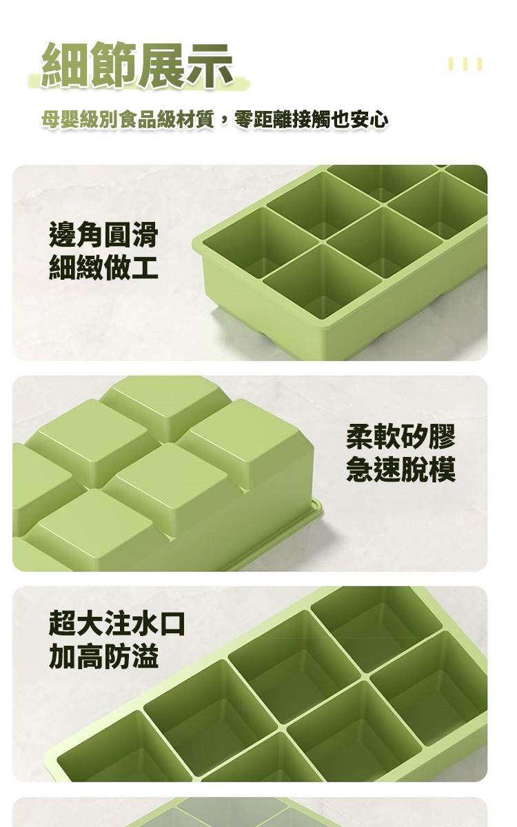 ●多重複使用且耐熱●軟細膠設計秒脫不沾●密封防味冰箱安心●大冰塊滿足冰飲快感規格:綠色材質:食品級矽膠容量:8顆尺寸: 如圖片所示重量:158g材積尺寸:15*13*5.5cm內容物包裝: 模具*1+蓋子*1